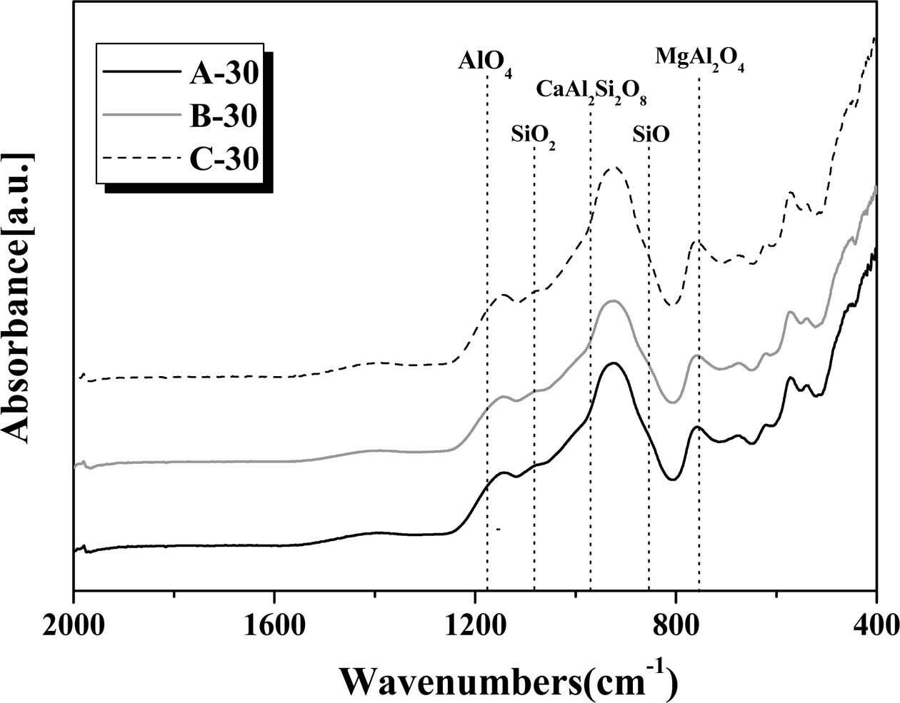 Fig. 8 shows the FTIR spectra of the glass–ceramic glazes heat-treated for 30 min at the temperature of 1000~1100 oC with a holding time of 30 or 60 min. The absorption peaks near 853 and 1179 cm−1 correspond to the vibrations of Al-O4 tetrahedra and Si-O bonds, respectively [19, 20]. The absorption peaks at 1080–1088 cm−1 arise due to the presence of amorphous SiO2, and the Si-O bands can be attributed to the α-coordination of the nanocrystals. The nanocrystalline α-cordierite structure contains both Si-O-Al and Si-O-Mg bonds [19, 21, 22]. The absorption peak at approximately 975 cm−1 is attributed to the anorthite crystal phase [23]. Several sharp and narrow absorption peaks arise in the 1300–800 and 800–500 cm−1 regions, which can be ascribed to the crystallization of SiO2 within the amorphous glass structure.