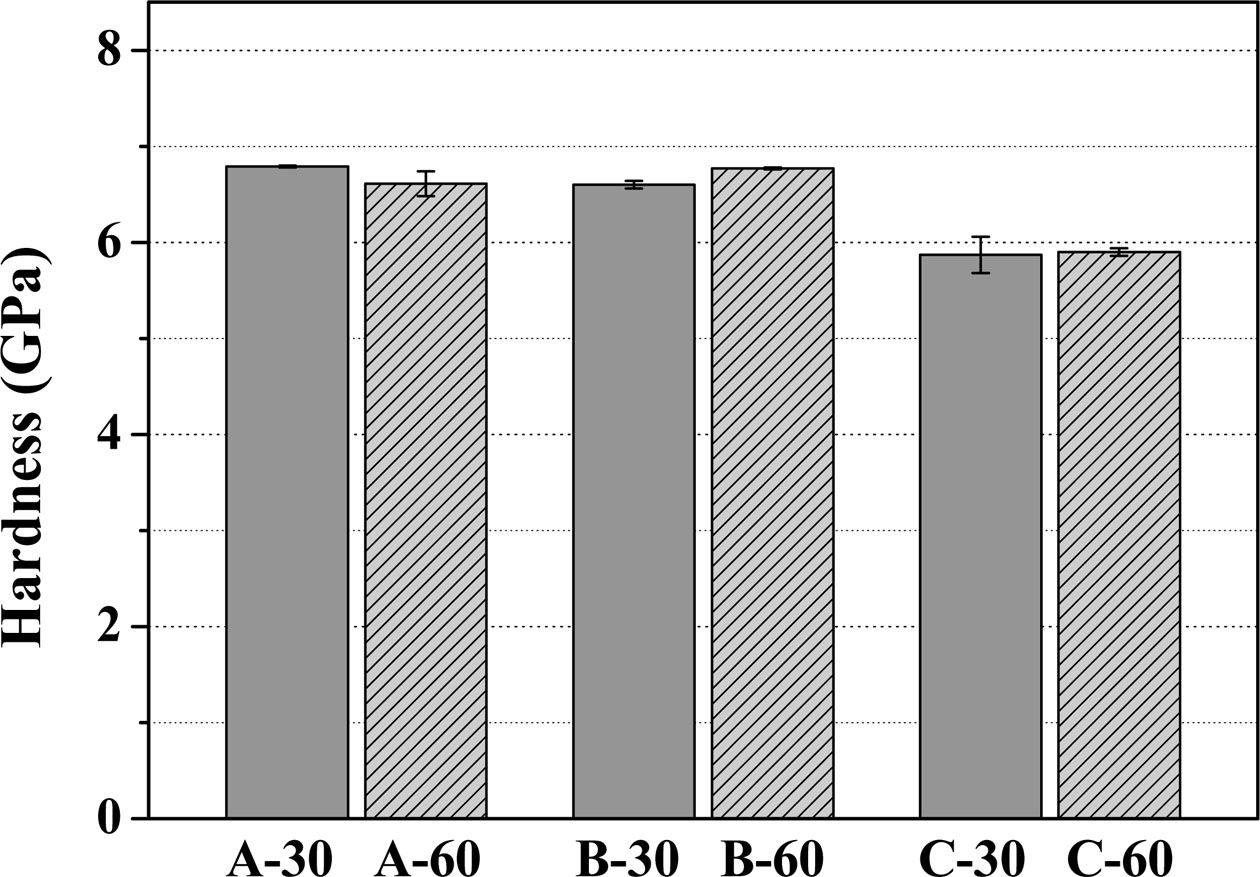 Fig. 9 shows the density and water absorption of the glass–ceramic glaze heat-treated for 30, 60 min at the temperature of 1000 oC~1100 oC. The density of the glass–ceramic glaze was 2.6–2.65 g/cm3, and holding time had no impact on this range at the maximum heat-treatment temperature (1100 oC). The overall density of the cordierite crystal phase was measured to be 2.65 g/cm3, and the anorthite crystal phase density was 2.73 g/cm3. The studied glass–ceramic glazes exhibit a high degree of crystallinity (~75%) and are considered to have lower densities than their individual crystalline phases. The water absorption of the glass–ceramic glazes was found to be low (≤0.2%), with the highest water absorption observed at 1100 oC. The water absorption of the studied crystalline glazes satisfies the water absorption criterion (<3.0%) of KS L 1001 “Ceramic tiles”. In addition, it also satisfies the water absorption criterion (<0.5%) of porcelain tiles in ISO 10545-3 “Ceramic tiles-Part 3: Determination of water absorption, apparent porosity, apparent relative density and bulk density” [24, 25]. The decrease in density and increase in water absorption with increasing heat-treatment tem- perature is thought to be the result of cracking during the heat treatment for glaze crystallization, which was confirmed by the microstructure of the glaze shown in Fig. 6.