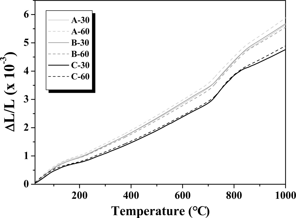Table 2 and Fig. 11 show the thermal expansion coefficient (α) of the glass–ceramic glazes heat-treated for 30, 60 min at the temperature of 1000 oC~1100 oC. The heat treatment at 1000 oC resulted in a thermal expansion coefficient of 5.75×10-6 oC−1, while a lower coefficient of 4.93×10-6 oC−1 was obtained when the heat treatment was carried out at 1100 oC. When the thermal coefficient of the glaze and the clay body are poorly matched, the glaze can be subjected to compressive force (thermal expansion coefficient of the glaze < thermal expansion coefficient of the clay body) or traction force (thermal expansion coefficient of the glaze > thermal expansion coefficient of the clay body) to allow the formation of stress-induced defects in the glaze [28]. Fig. 12 13 14 15 16