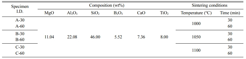 Commercially available materials were obtained from KOJUNDO Chemical Co., Japan, (CaCO3, 99%; MgO, 99.9%; SiO2, 99.9%; B2O3, 99.9%; TiO2, 99.9%) or SANCHUN PURE Chemical Co., Korea, (Al2O3, 99.0%) and used without further purification.