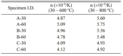 Fig. 11 CTE of the glass-ceramic glaze heat-treated for 30, 60 min at the temperature of 1000 oC ~ 1100 oC. |