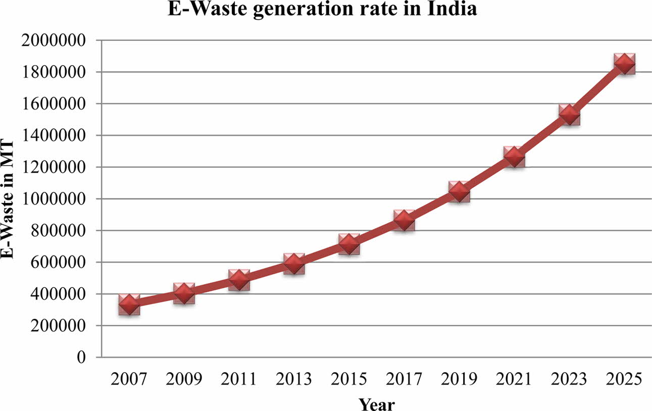 India is one of the countries most affected by the e-waste problem, yet until 2012, there was no compre- hensive electronic waste law in existence.This might be because it was not seen as a potential threat that needed to be addressed appropriately. According to the Dangerous Wastes Rules (1989), e-waste is not deemed hazardous unless it is shown to have a higher concentration of specified substances. However, none of the above-mentioned environmental laws made a direct and specific reference to electronic waste processing as hazardous. In the Indian context, the study found that the yearly E-waste creation rate is predicted to be dangerously high [14], with Chennai (2 MT), Bangalore (21 MT), Mumbai (10.1 MT), and Delhi (9.1 MT) accounting for about 24% of total e-waste output. According to the research [15], the annual generation of E-waste has risen drama- tically every year, as seen by the graph below (Fig. 2). More than 40% of obsolete electrical goods in India are believed to be sitting idle in homes or warehouses because people are unsure what to do with them. Recycling and processing of discarded PCBs in e-waste are nearly exclusively handled by the informal sector and are totally driven by market forces. Because of insufficient base and metal recovery, the use of crude techniques creates occupational and environmental risks, as well as a loss of valuable resources.