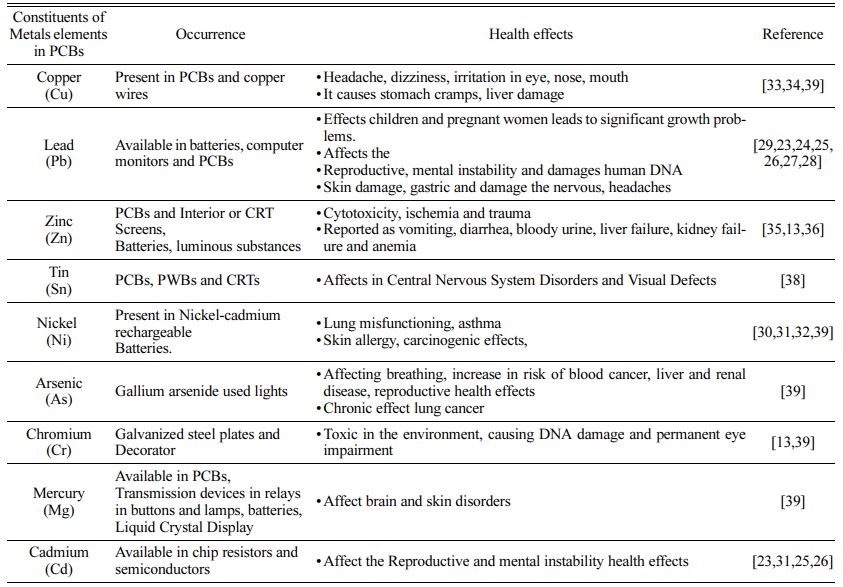 Table 2 Hazardous toxic metals present in printed circuit boards and their Health effects |