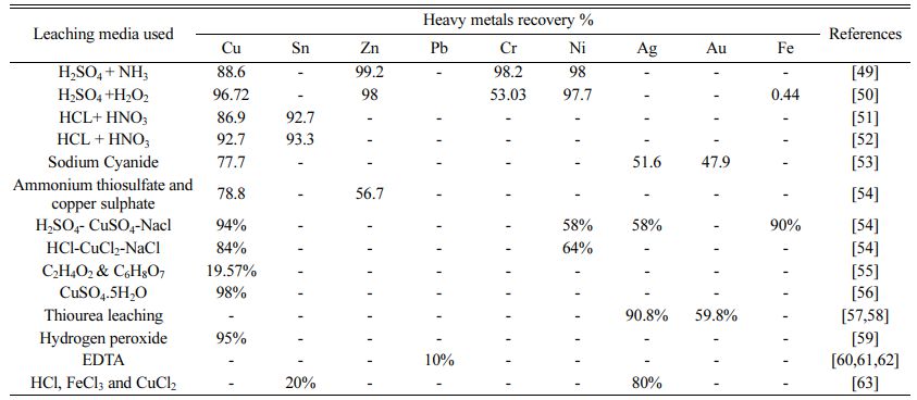 The recycling of PCBs is therefore a major issue, as not only the recycling, re-use, and waste disposal but also the separation of valuable metals from their respec- tive leaching media [60-62] is a an important aspect. Previous research findings have been recorded for the recovery of valuable metals from various PCB waste in various leaching media such as acid leaching, Aqua regia, NaOH, H2SO4+NH3, H2SO4+H2O2, HCl+HNO3, HCl+HNO3, Sodium Cyanide, Ammonium thiosulphate, and copper sulfate, H2SO4-CuSO4-NaCl, HCl-CuCl2-NaCl, C2H4O2&C6H8O7, CuSO4·5H2O, Thiourea leaching, Hydrogen peroxide, EDTA, HCl, FeCl3 and C6H8O7. These leaching media have individual dissolving and dissolving properties of metals and also have advantages and disadvantages for the particular metal recovery method. As a result, several researchers have successfully extracted heavy metals from printed circuit boards using hydrometallurgical techniques. However, these processes are associated with certain disadvantages that limit their application to the treatment sectors. Some common limitations of hydrometallurgical methods for recovering PCBs are listed here [63].
