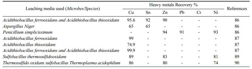 Previous research on the dissociation of heavy metals by microorganisms has used leaching operations under different controlled circumstances, such as temperature, duration, concentrations, and pH. Experiments are carried out with the appropriate variety of irons and the addition of a complexing agent, ensuring ideal circumstances for the microbe's development in the different para- meters listed above. For the recovery of heavy metals from PCBs by microbial leaching, these conditional parameters are used [79-82]. Acitithiobacillus ferrooxidans and Acitithiobacillus thiooxidans are Cu 95.6%, Sn 92%, Zn 90% recovered, Aspergillus Niger Cu 65% and Sn 65% recovered, Penicillium simplicissimus mare Zn 94%, Pb 91% recovered, Ni 93% recovered [78], Acidithiobacillus ferrooxidans 99% recovered, Acidithiobacillus thiooxidans 74.9% recovered, Acidi- thiobacillus ferrooxidans and Acidithiobacillus thiooxi- dans are Cu 99% recovered [83], Sulfobacillus thermo- sulfidooxidans are Cu 89%, Zn 83%, Ni 81% recovered [84], Sulfobacillus thermosulfidooxidans, Thermo plasma acidophilus bacteria are Cu 86%, Zn 80%, Ni 74% [85-86] separated from metal concentrates of waste PCBs.