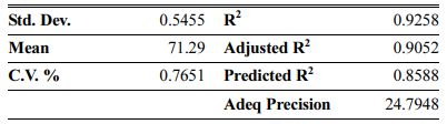 As can be seen, the predicted R2 of each model is in reasonable agreement with its adjusted R2; i.e. the difference is less than 0.2. The adequate precision, which measures the signal-to-noise ratio, also indicates that the models can be used to navigate the design space.