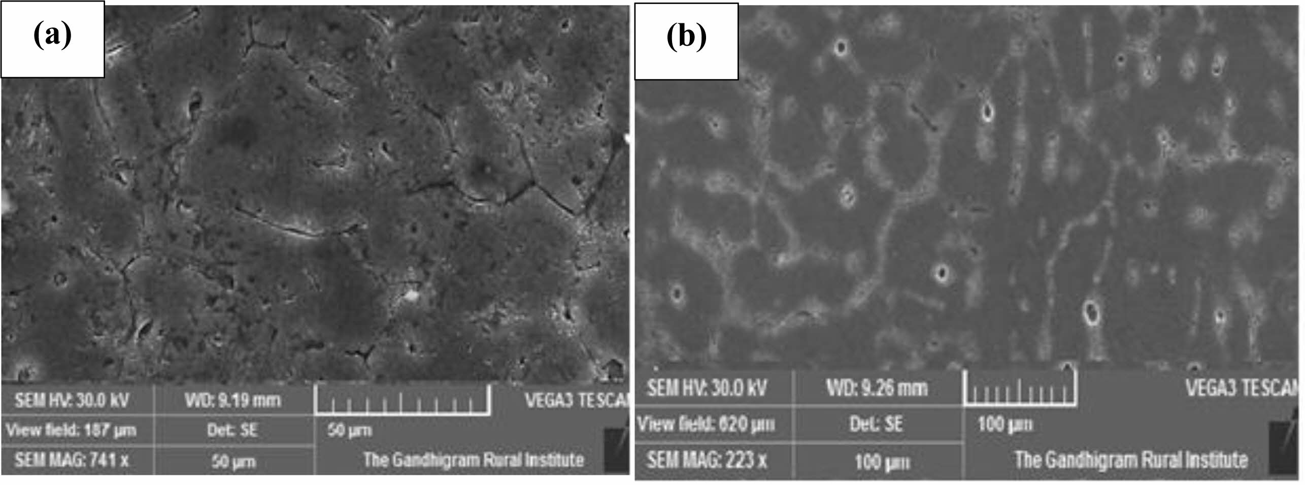 Figs. 1(a & b) shows the optical microscope image of cryogenic treated samples such as 49Ni-51Ti and 47.5Ni-49.5Ti-1.5MWCNT. Before cryogenic treatment, the NiTi phase was termed as austenite and following that complex body-centered cubic crystal structure was formed. In reverse, at low temperature, martensite following that monoclinic crystal structure was formed and displayed in Figs. 1(a & b). The careful observation was also made on the cryogenic treatment samples using SEM. Figs. 2(a & b) shows the SEM images of 49 Ni-51 Ti and 47.5Ni-49.5Ti-1.5MWCNT treated samples and it illustrates that the secondary particles are evenly distributed in the matrix (49Ni-51Ti). Following that the elemental confirmation was assessed using Energy Dispersive Spectroscopy (EDS) analysis and exhibited in Figs. 3(a & b). From Figs. 3, the presence of Ni, Ti and MWCNT are confirmed. Before and after treatment, no reaction occurred; further the grain structure was changed from austenite to martensite.