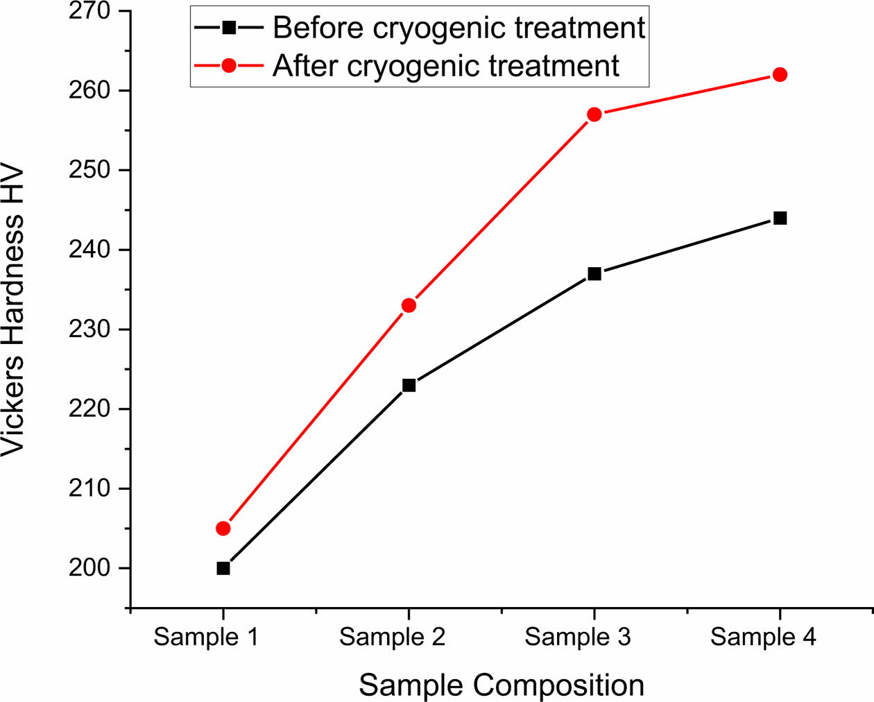 Afterwards, the samples were cryogenically treated at -77 K in the liquid nitrogen environment. The hardness of the samples was evaluated using Vickers Hardness. The high temperature wear behaviour of the samples was evaluated using pin-on-disc apparatus at the temperature range of 30 oC, 50 oC, 100 oC, 150 oC and 200 oC. After wear analysis, the sample surfaces were assessed using SEM. The detailed analysis is deliberated in subsequent sections.