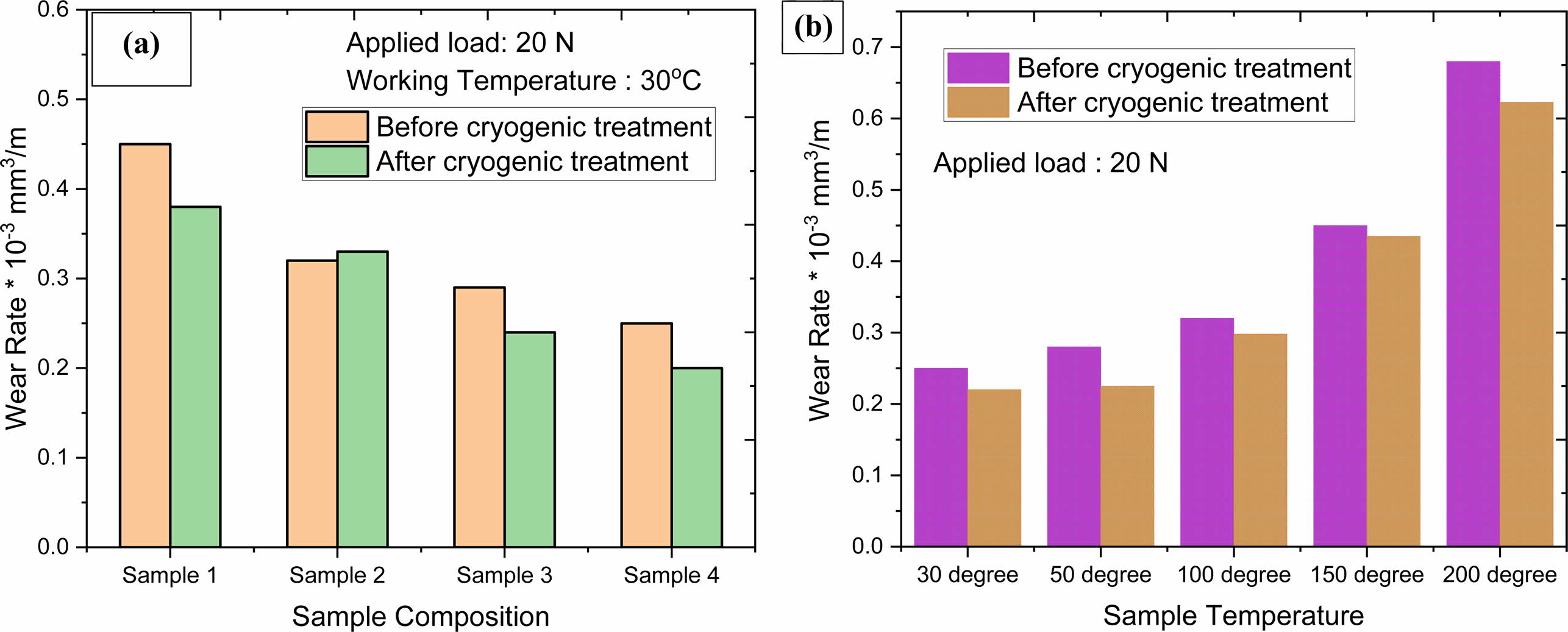 Fig. 6 High Temperature wear rate analysis: (a) based on sample composition and (b) based on sample temperature. |