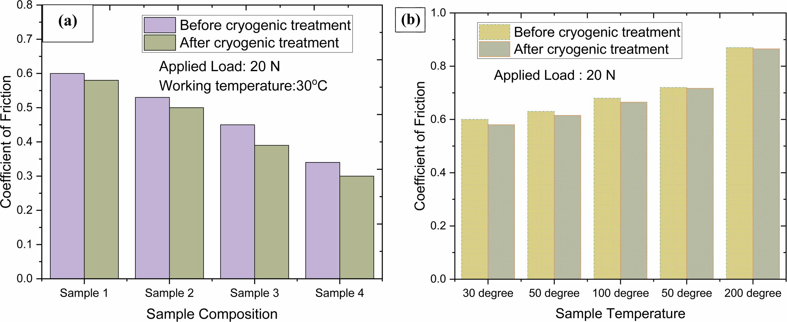 Fig. 7 High Temperature coefficient of friction analysis: (a) based on sample composition and (b) based on sample temperature. |