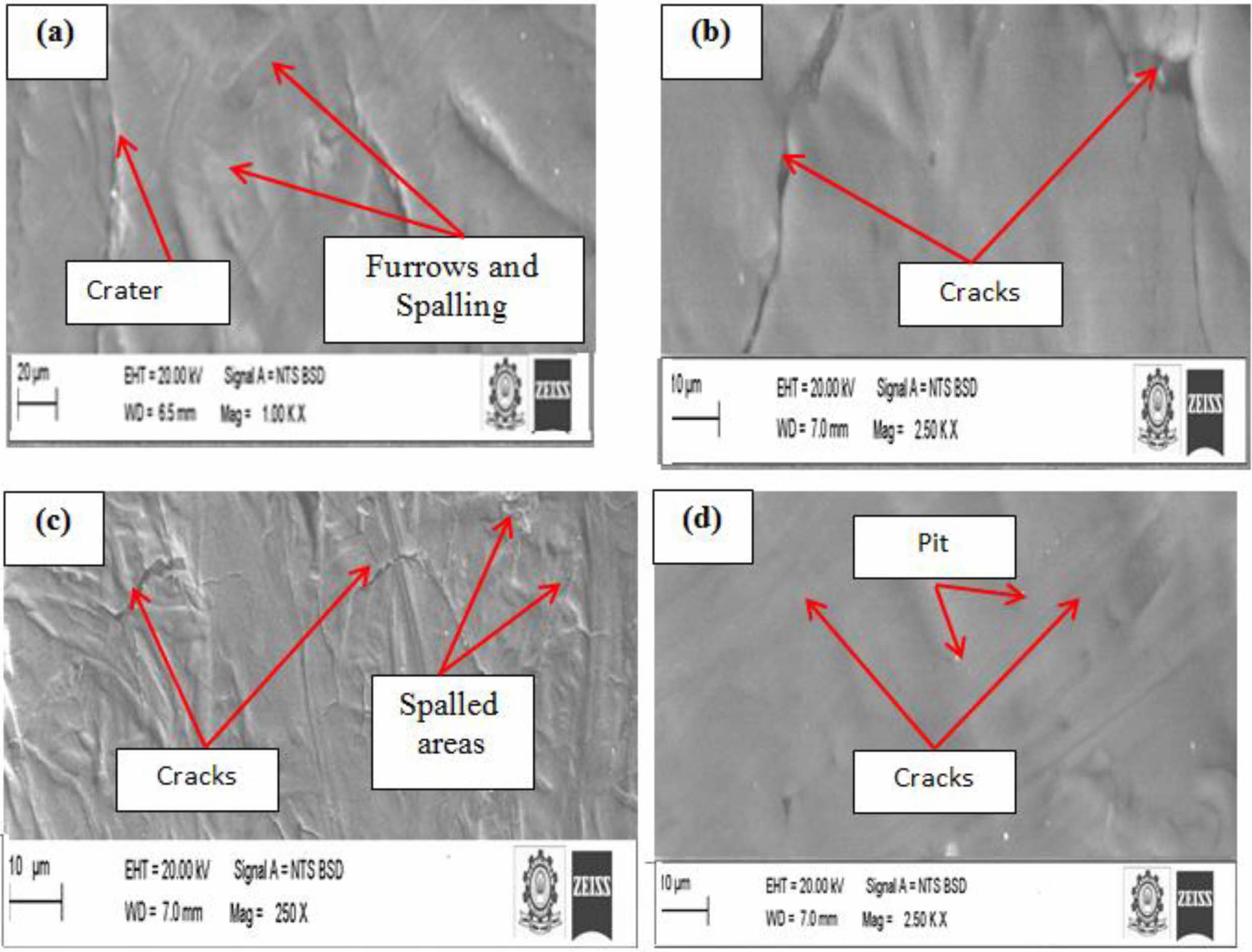 Secondary electron images of worn surface analysis for before and after treatment are displayed in Figs. 8(a-d). From Figs. 8(a and c), it illustrates that the present wear mechanisms which comprise crater, furrows and Spalling were observed before treatment. The wear degree was varied based upon the position. Under continual impacts, abrasive friction was created and it led to a plastic deformation of the un-treated samples becoming severe. Furthermore, many defects are derived in the sample surface such as microcracks and stress attention. It starts the material flow before work hardening. The wear experimentation will take place over a long period, it creates impact wear and it reaches the higher limit and hence the specimen surface layer is separate, which causes higher material loss. The entire un-treated area possessed a similar phenomenon in the worn morphologies which creates tiny furrows, flat hardened areas, visible cracks and Spalled areas. After treatment, some defects are noticed like pits and grooves and no evidence of material loss are observed during pits. The worn surface of 47.5Ni-49.5Ti-1.5MWCNT after treatment and 200 oC temperature sample was assessed for further investigation. Fig. 8(d) displays the SEM images relating the worn surface of 47.5Ni-49.5Ti-1.5MWCNT after treatment and 200 oC, the worn surface regime, shows some dark layers and structural deformation regime are observed on the surface [24]. The dark layer has a hardened layer and it is difficult to wear. This is an important phenomenon of the worn surface of Ni-Ti alloy after cryogenic treatment. Further increasing the sample temperature from 100 oC to 200 oC, some outermost layers are observed, which is called the second layer of oxide layer. It acts as a shielding of the sample and reduces surface wear. On the other hand, during experimentation, the initiation and expansion of the surface and oxide layer and also subsurface cracks is having a strong influencing parameter for material loss before treatment [25-27]. However, plastic deformation accrued endlessly over the period of time, which will increase the sample hardness which is closely correlated with the Fig. 5 and it can reduce plasticity considerably.