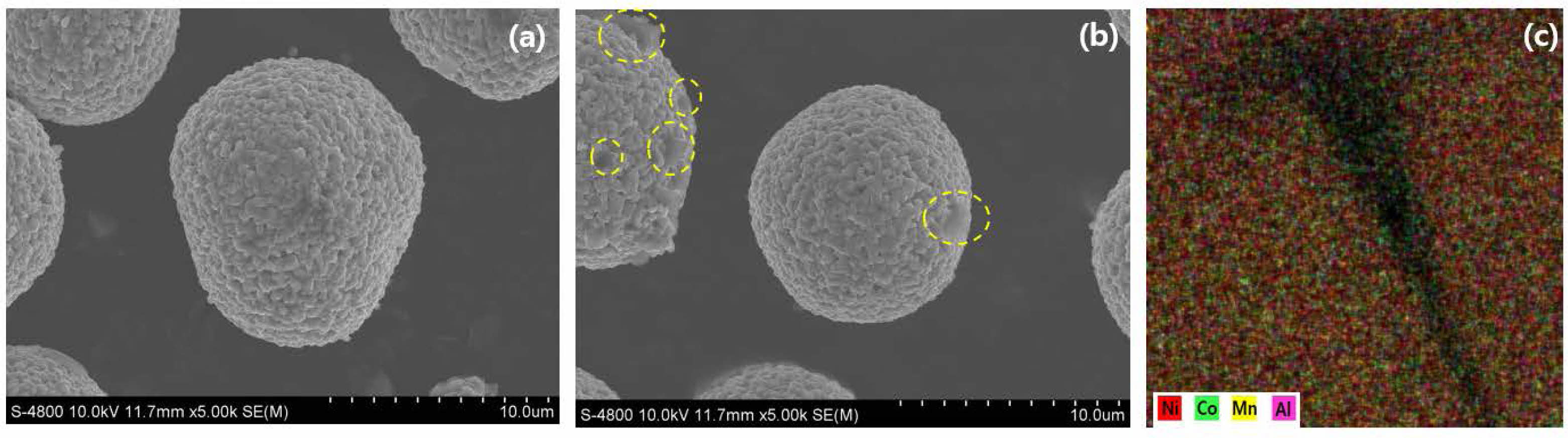 Fig. 2 shows the microstructures of (a) Al-doped, (b) pristine LiNi0.91Co0.06Mn0.03O2 and (c) EDS mapping of Al-doped LiNi0.91Co0.06Mn0.03O2. It can be seen that there is no big difference between both samples. Both samples have a similar secondary particle size of 11.5 μm and the same spherical shape with porous structures. The size of primary particle sizes, constituting the secondary particles, are in the range from 100 to 200 nm for both samples. Based on these, it was confirmed that Al doping did not clearly affect particle morphology or size. The significant difference between the both samples is the surface chemistry. In the case of the xx-modified sample, the surface is clean, but in the case of the pristine sample, it can be confirmed that there are impurities such as LiOH and Li2CO3 on the surface, as indicated by the yellow circle. These materials are due to the low structural stability of the pristine sample. In many previous papers, it has been reported that performance degradation is caused by existence of unwanted lithium compounds on the Ni-rich cathode surface. As shown in Fig. 2(c), the successful Al modification can be confirmed through EDS mapping. In the case of the Al modified sample, the chemical stability of the Ni-rich NCM can be explained by the Al substitution.