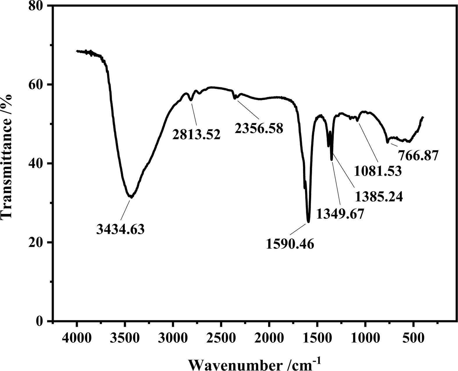 The GO used in the experiment is a monolayer powder produced by KNA Carbon New Materials Co, Ltd. with earthy brown color, its flake diameter is between 0.2 μm and 10 μm, its purity is 96%, its main chemical compositions contain 48% carbon, 45% oxygen and < 3% sulfur. The Fig. 1 shows the Fourier Transform Infrared Spectrometer (FTIR) spectra of GO, where O-H, C-H, C=C groups at 3434.63, 2813.52, 1590.46 cm-1, respectively, which indicates that GO has high activity. Fig. 2