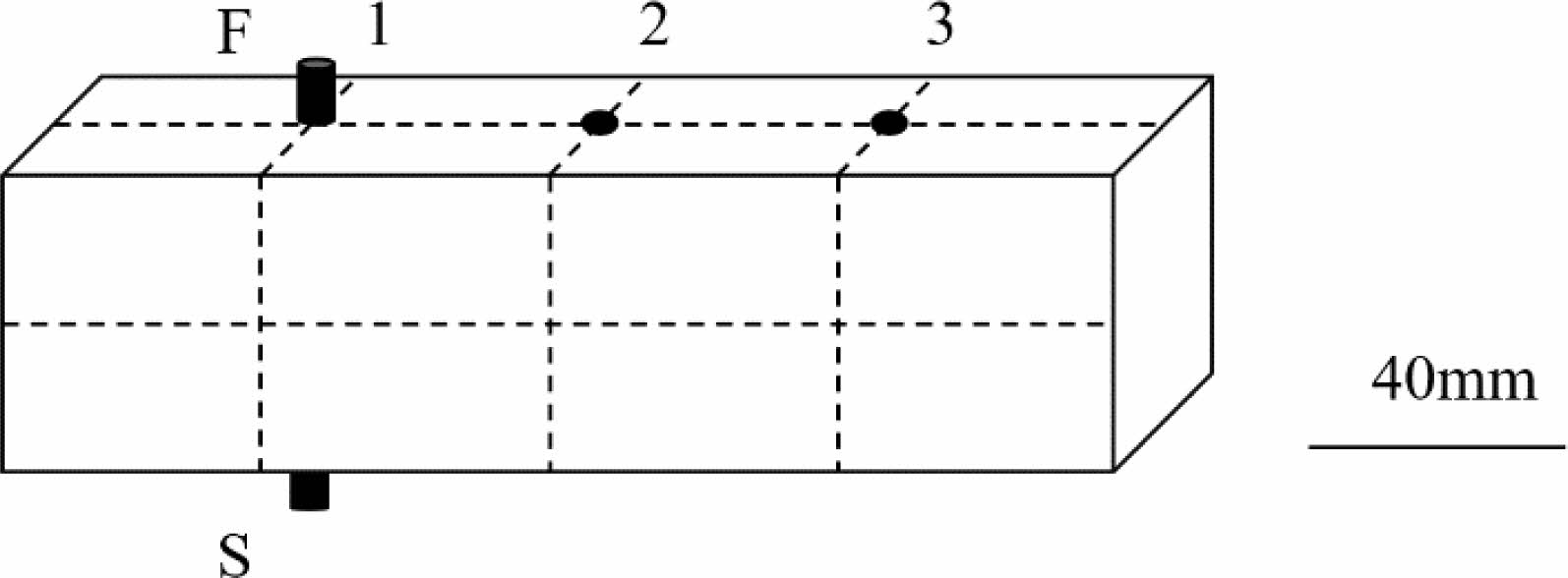 Fig. 2 Illustration of the compactness measure for specimen by a nonmetallic ultrasound detector (1-3 vertical direction; F-the transmitting transducer; S-the receiving transducer). |