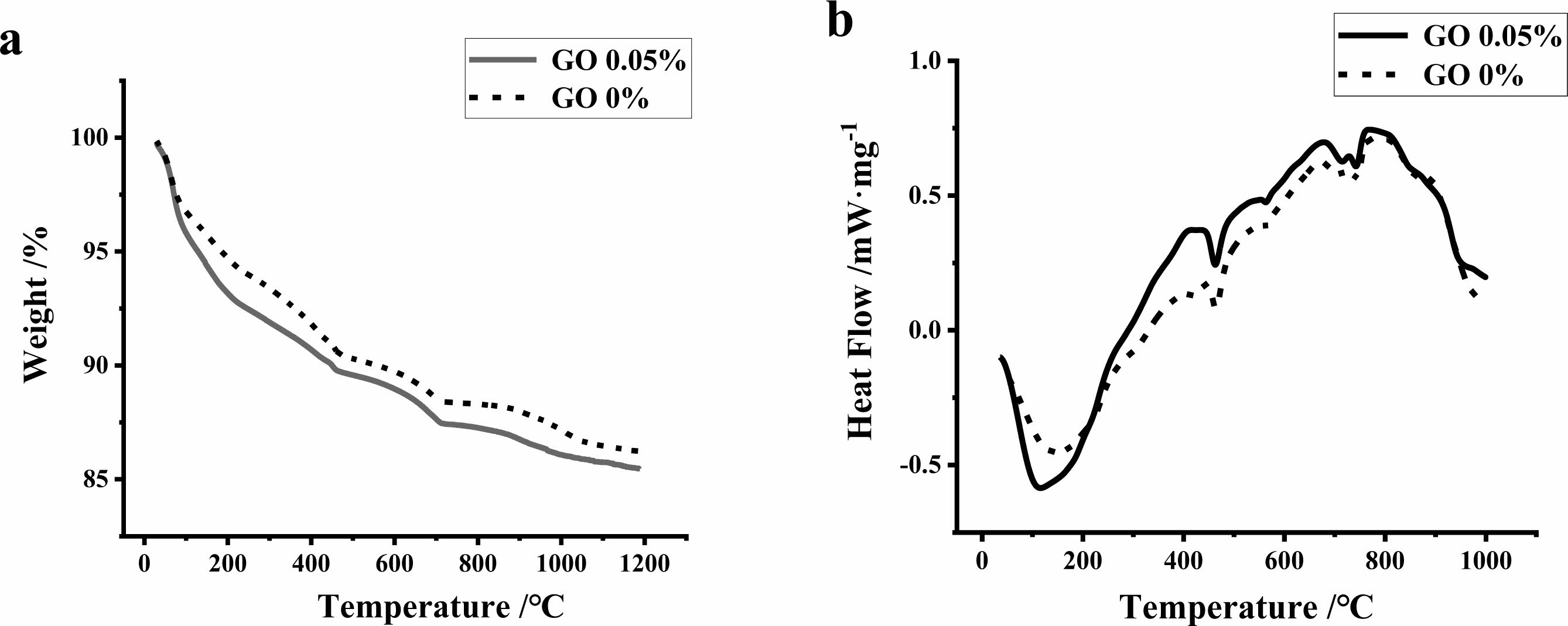 (3) From the DSC/TGA analysis, the weight loss of specimens without and with GO at 400 ℃ was 8.22% and 9.31%, respectively, which indicates that GO increases the hydration of high-strength concrete. At around 500 ℃, more heat is required for the decomposition of hydration products with GO addition, indicating that GO improves the heat resistance of cementitious materials.