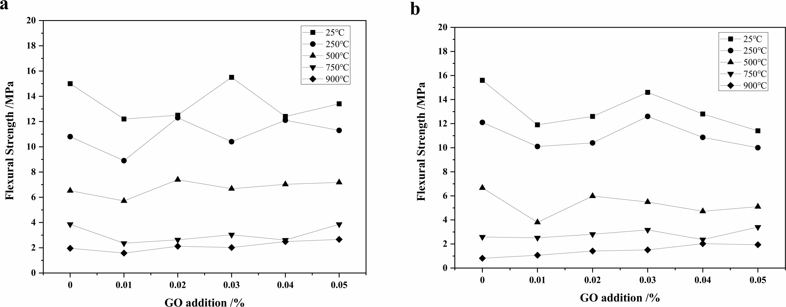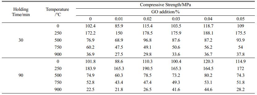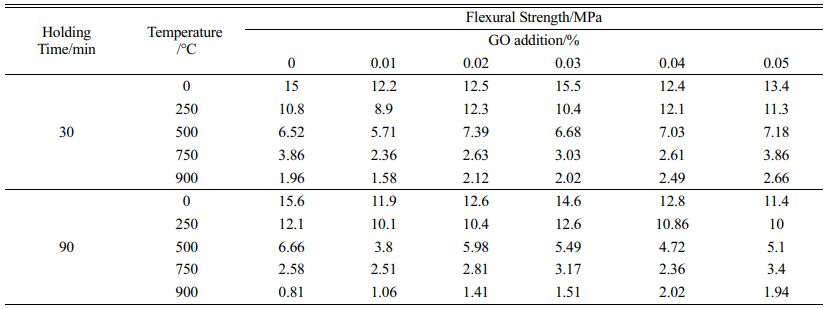 (2) GO can improve the mechanical properties of cementitious composites after sintering, and the improvement of residual flexural strength of high strength concrete with GO after high temperature treatment is greater than that of concrete without GO. GO addition has a significant effect on the mechanical properties of concrete treated at less than 500 ℃, which can improve the heat resistance of concrete, but for the mechanical properties of concrete treated at 750 ℃ and 900 ℃ heating, GO addition has a weak effect.