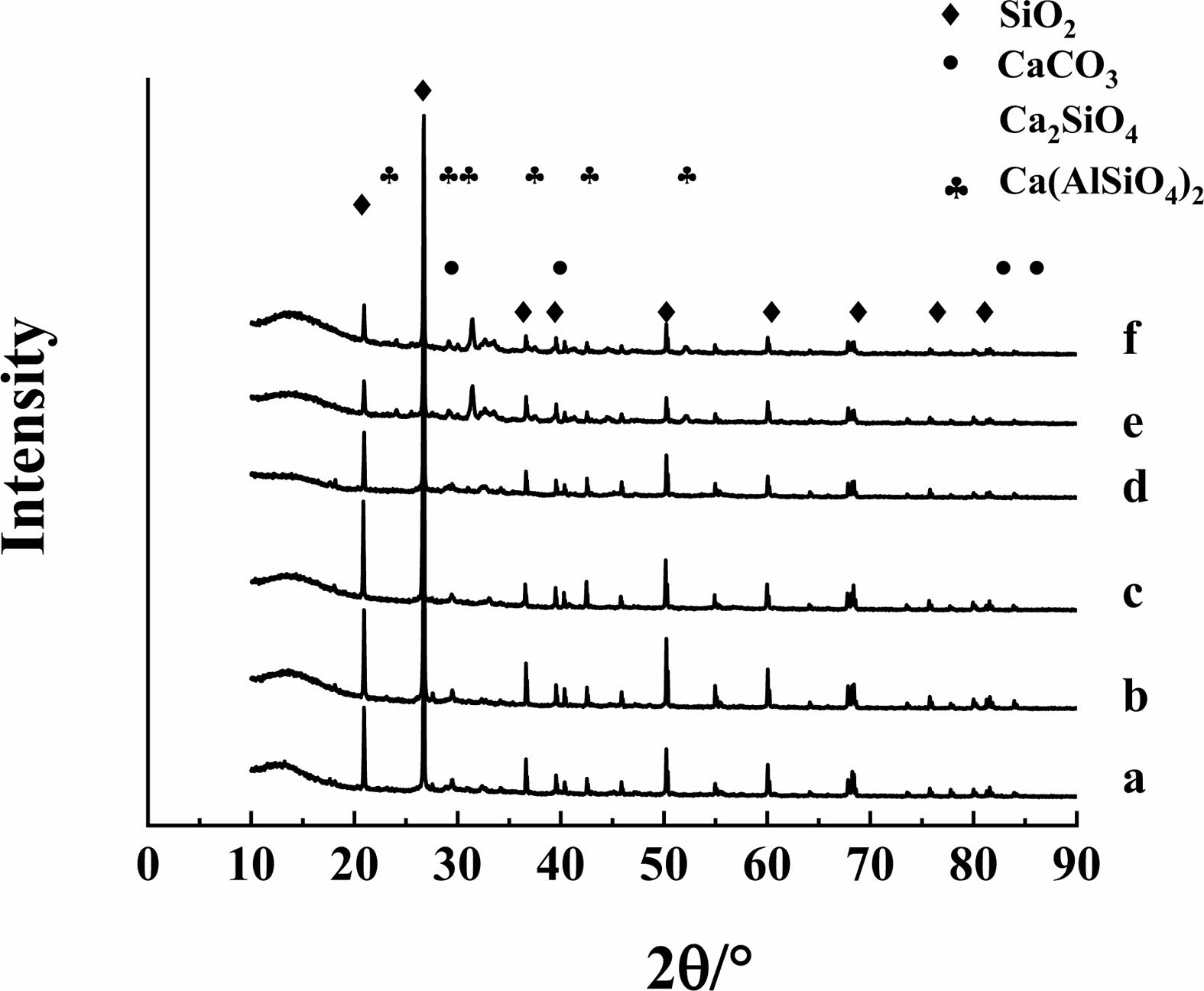 Fig. 8 Concrete XRD test results (a-0%-25℃; b-0.05%-25℃; c0%-500℃; d-0.05%-500℃; e-0%-900℃; f-0.05%-900℃. Take a-0%-25℃ as an example, where a is the number, 0% is the GO addition, and 25℃ is the treatment temperature). |