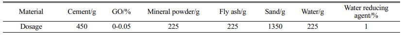 GO has hydrophilic functional groups and is prone to agglomeration in water [23], so it cannot be directly added into the stirring mixer, and it is necessary to disperse GO in water by ultrasonic. The ultrasonic dispersion time and power will affect the dispersion of GO in water [20], and this experiment used a 100 W ultrasonic dispersion instrument with a water bath to disperse for 10 min. After dispersion, GO was immediately added to the planetary mixer, and the mixing was completed according to the national standard GB/T 17671-1999 “Test method for cementitious sand strength (ISO method)” [24].