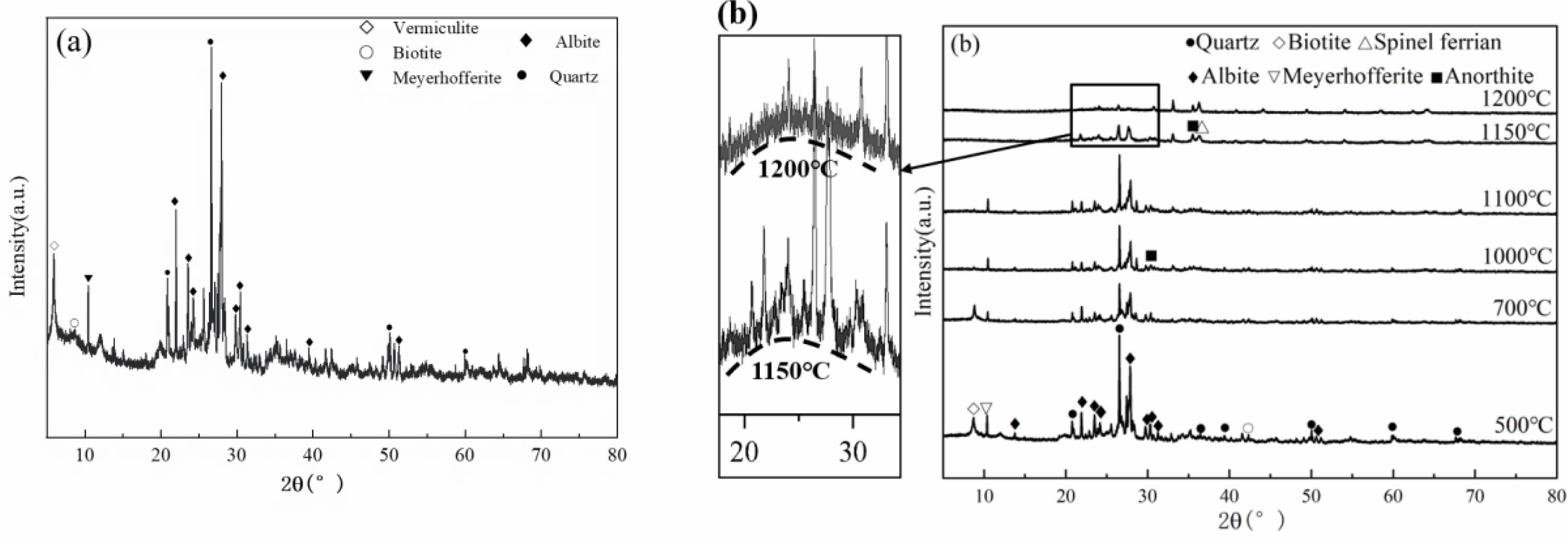 The tailings were wet ground by the ball mill, and then dried. Fig. 1(a) illustrates the X-ray diffraction analysis results. The main mineral phases of the tailings are quartz and albite, and contain a small amount of vermiculite and biotite too. The tailings were pressed into flake samples, and then were heated at different temperatures.