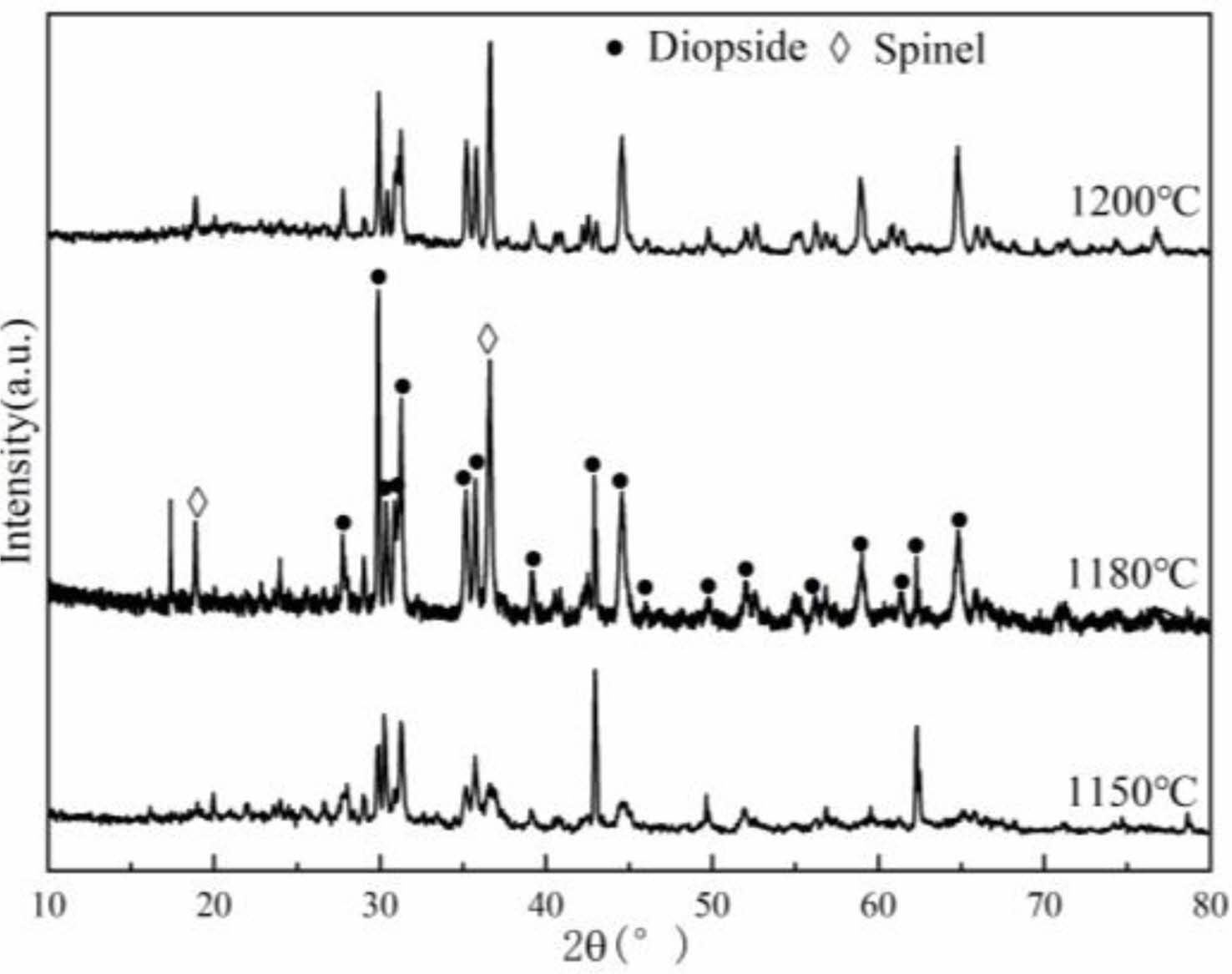 The XRD patterns of porous ceramic samples sintered at different temperatures are shown in Fig. 2. It can be seen that, the phases of the porous ceramic samples are mainly diopside and a small amount of magnesia alumina spinel.