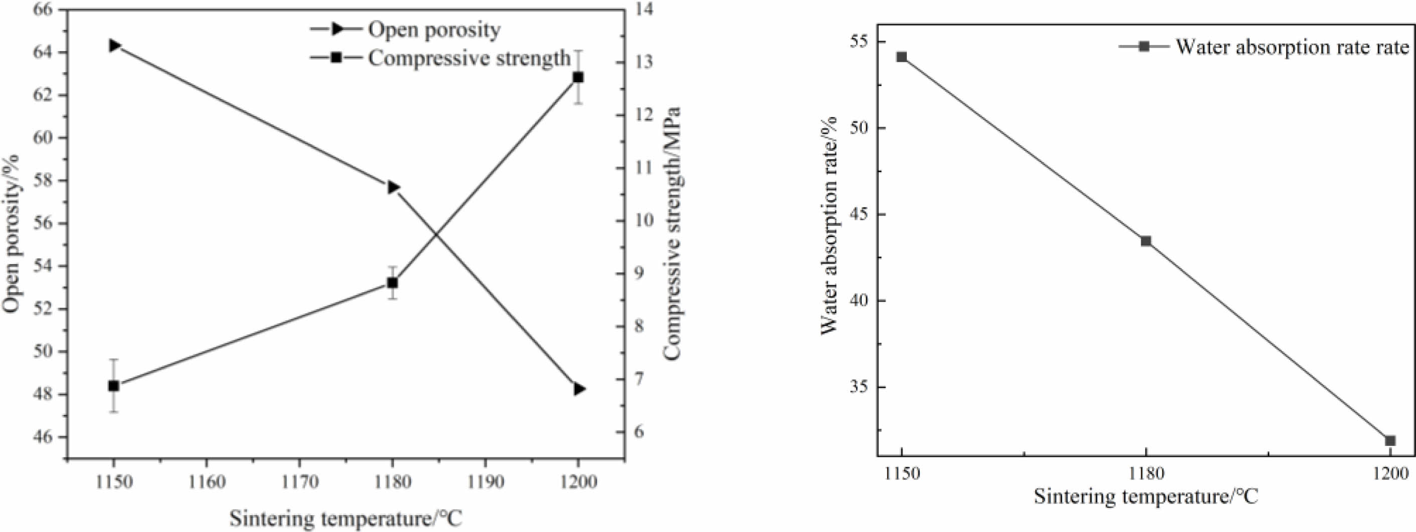 The distribution of pore sizes and physical properties of porous ceramic samples sintered at different temperatures are shown in Fig. 3 and Fig. 4. It can be seen that, with the increase of sintered temperature, the average pore diameters of the samples are decreased and gradually concentrated between 0.1 and 0.2 mm. The open porosity and water absorption rate of the samples are decreased, and the compressive strength of the samples is increased with the increase of sintered temperature. On the one hand, with the increase of sintered temperature, the content and fluidity of liquid phase are increased, so the size and number of pores in the sample are decreased, and the compressive strength is increased [24]. On the other hand, with the increase of sintered temperature, the diffusion ability of atomics is enhanced, the growth rate of particle interfaces is accelerated, the pores are gradually reduced. At the same time, the particle interface moves continuously, the pores migrate to the particle interface and disappear, and the density of pore wall is increased, so the compressive strength of the sample is increased [25].