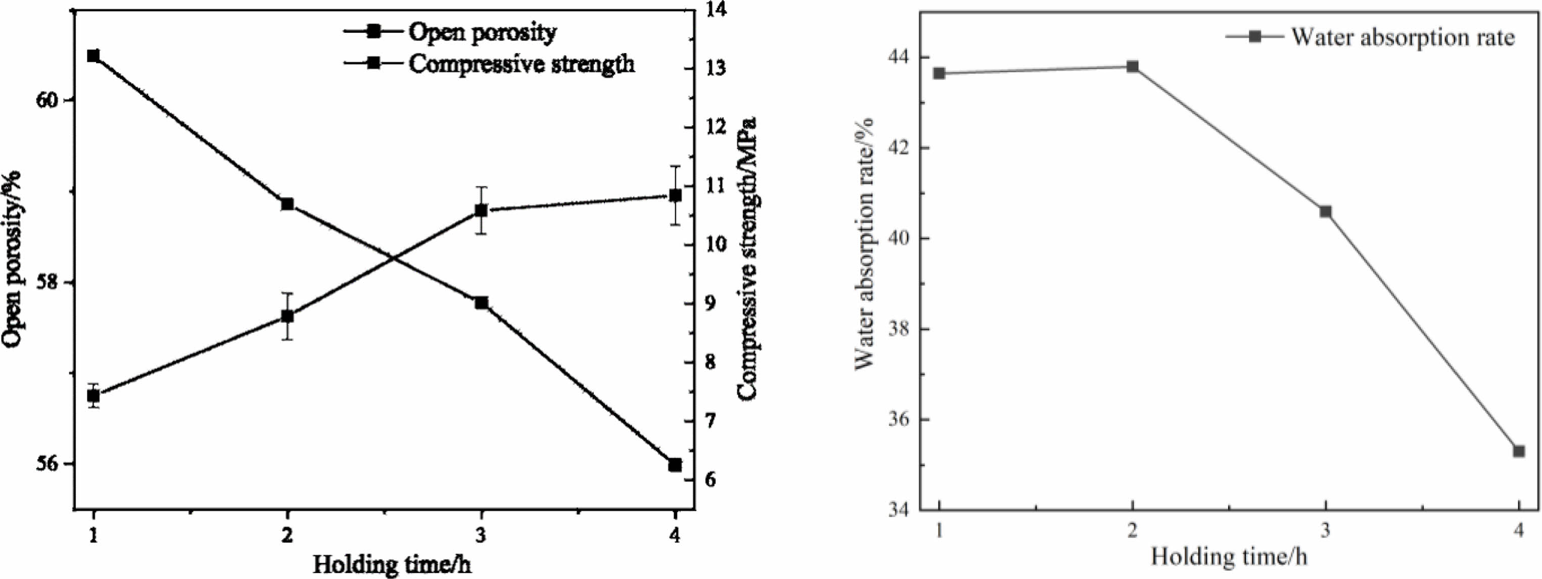 The physical properties of porous ceramics obtained with different holding times are shown in Fig. 6. It can be seen that, with the extension of holding time, the compressive strength of the sample is increased. The open porosity and water absorption of the samples are decreased. This is because with the extension of holding time, the liquid phase promotes the rearrangement of particles, and the gas in the samples move to the interface and disappear, so the compactness is increased [26].