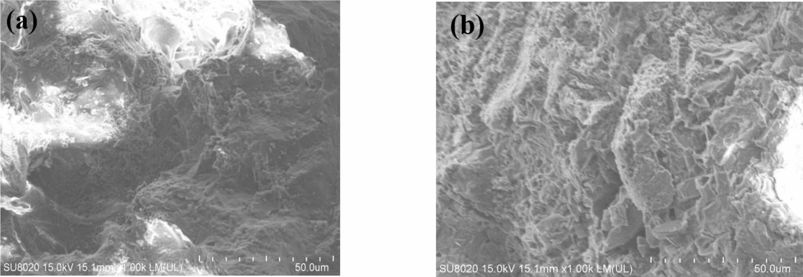 Fig. 7 SEM of porous ceramic samples before and after treatment (a: untreated b: treated) |