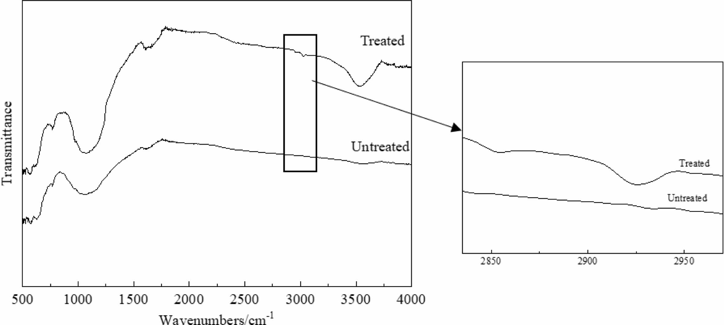 (2) After the samples are treated byγ-Aminopropyl triethoxysilane solution. FTIR analysis showed that the symmetrical stretching vibration peak and asymmetric stretching vibration peak of methylene (-CH2-) appeared at 2854 cm-1 and 2923 cm-1 respectively. The absorption peak strength of Si-O bond is increased significantly. This indicates that the methylene(-CH2-) is successfully loaded on the sample surfaces.