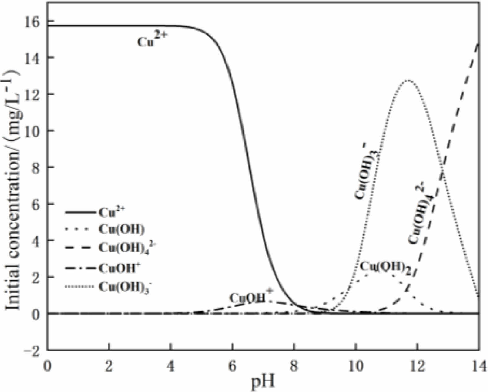 The visual MINTEQ software is used to simulate the morphological distribution of Cu(Ⅱ) in solution with different pH values at 25 ℃. The results are shown in Fig. 11. When the pH value of the solution is less than 7, copper exists in the form of Cu(Ⅱ) and Cu(OH)+. With the increase of the pH value of the solution, hydroxyl groups in the solution combine with Cu(Ⅱ), and the content of Cu(Ⅱ) is decreased. The Cu(Ⅱ) is transformed into Cu(OH)+ [19]. When the pH value of the solution is greater than 7, the copper containing hydroxyl group in the aqueous solution increases, and precipitation of Cu(OH)2 is produced at the same time. In this case, the change of Cu(Ⅱ) concentration in the aqueous solution will no longer affect the adsorption. Therefore, the maximum pH value of the aqueous solution taken in this experiment is 6.