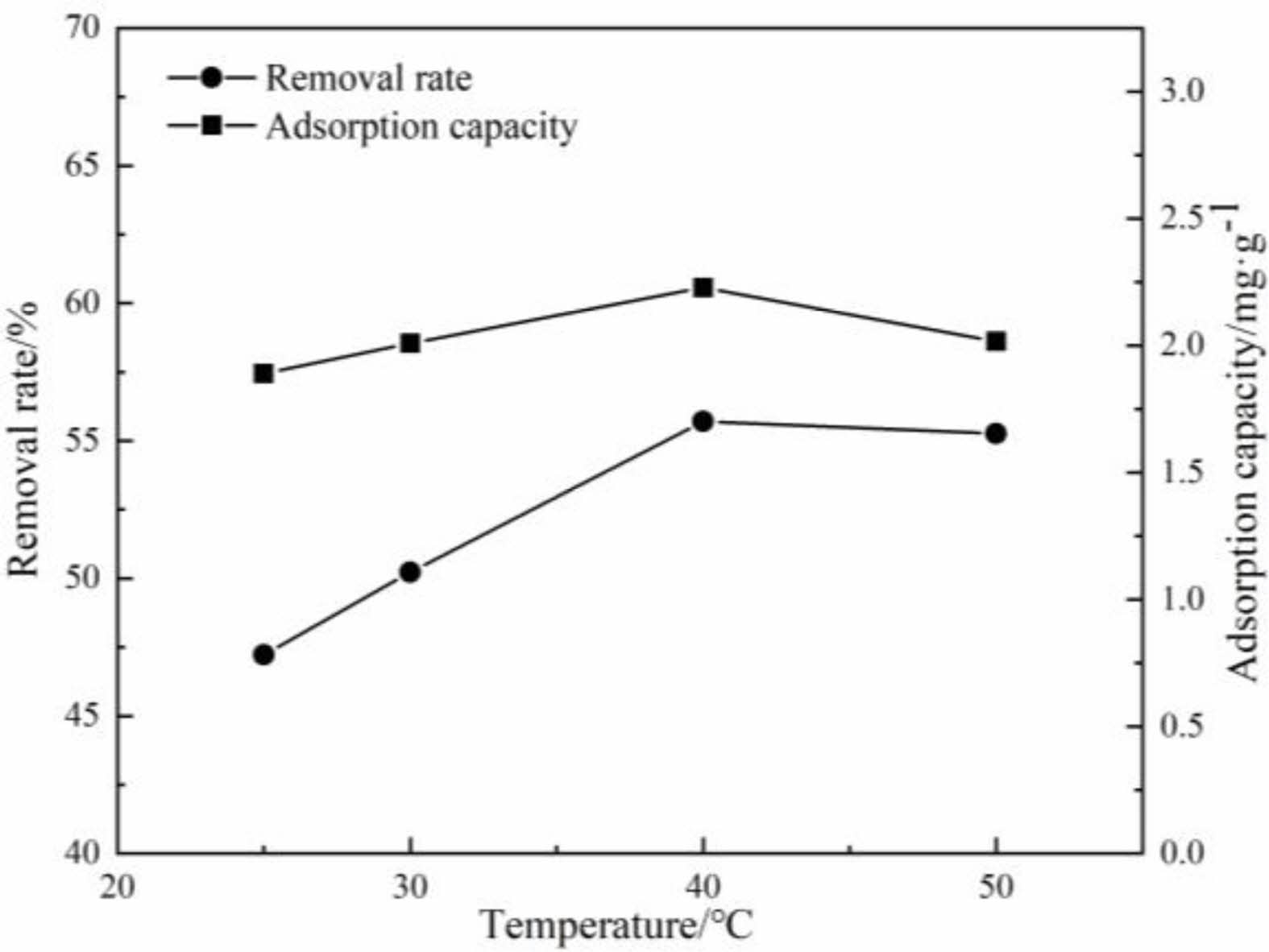 When the pH value of the aqueous solution is 5, the removal rate and the adsorption capacity of the samples to Cu(Ⅱ) by porous ceramics at different test temperatures are shown in Fig. 12. It can be seen that, the removal rate and the adsorption capacity of the samples to Cu(Ⅱ) are increased gradually with the increase of solution temperature, which is due to the increase of the activity of adsorption sites on the sample surfaces. On the other hand, with the increase of test temperature, the molecules move violently, which strengthens the diffusion of Cu(Ⅱ) to the surface or inside of the samples. Therefore, the increase of temperature is conducive to the adsorption process of Cu(Ⅱ).