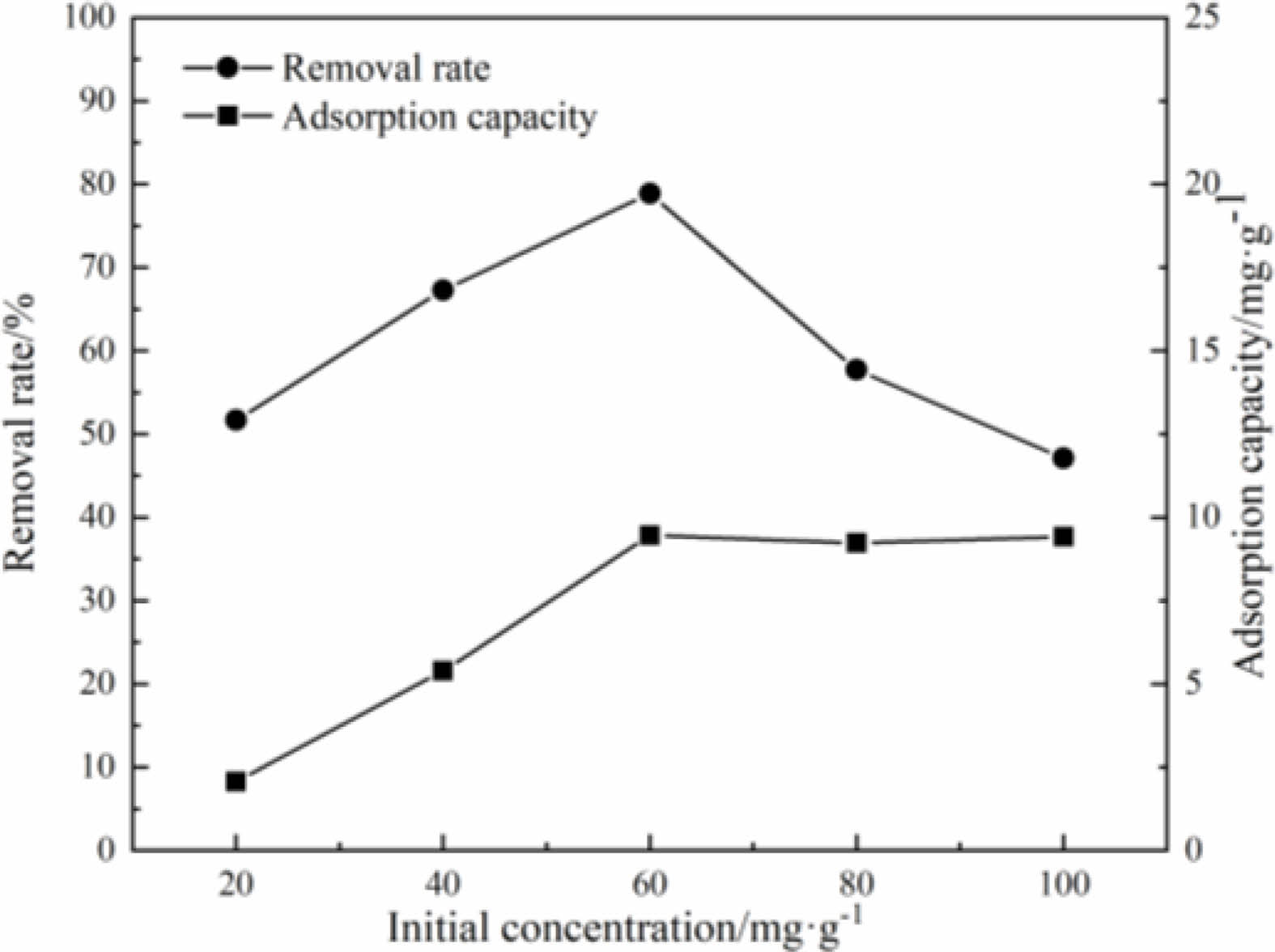 Under the conditions of aqueous solution temperature of 40 ℃, pH value of 5, the different initial concentration of solution effect on the removal rate and the adsorption capacity of the samples to Cu(Ⅱ) are shown in Fig. 13.