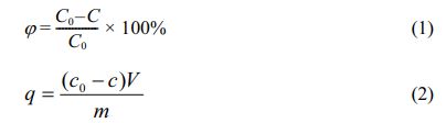 Where φ represents removal rate (%), C0 and C represent the initial and final ions concentrations of the solution, respectively. And q represents the adsorption capacity (mg/g), m represents the mass (g) of adsorbent and V represents the volume (L) of the solution.