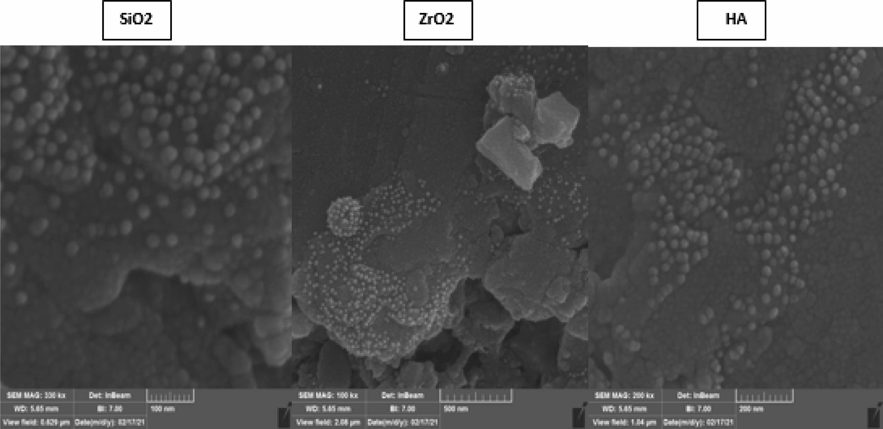 Figs. 4-5 highlight that the functionalized nanofillers are well dispersed into the polymer matrix, and the size of the nanoparticles is around 40 nm. Also, these images prove a better adhesion between the organic and inorganic phases. Also, significant agglomerations are visible while the distance amongst nanofiller particles (SiO2, ZrO2, as well as H.A.) is significantly larger than the size of the nanoparticles, thus proving good compatibility between the phases again, and the mechanism of fracture involves instead a polymer fracture instead of the polymer detaching from the surface of the nanoparticles. There are areas with high filler agglomerates. However, areas that are mainly polymer and these heterogeneities can substantially impact the mechanical properties. Overall, based on the SEM evaluation, surface modification with MPTMS is beneficial and leads to better dispersibility and compatibility within the polymer.