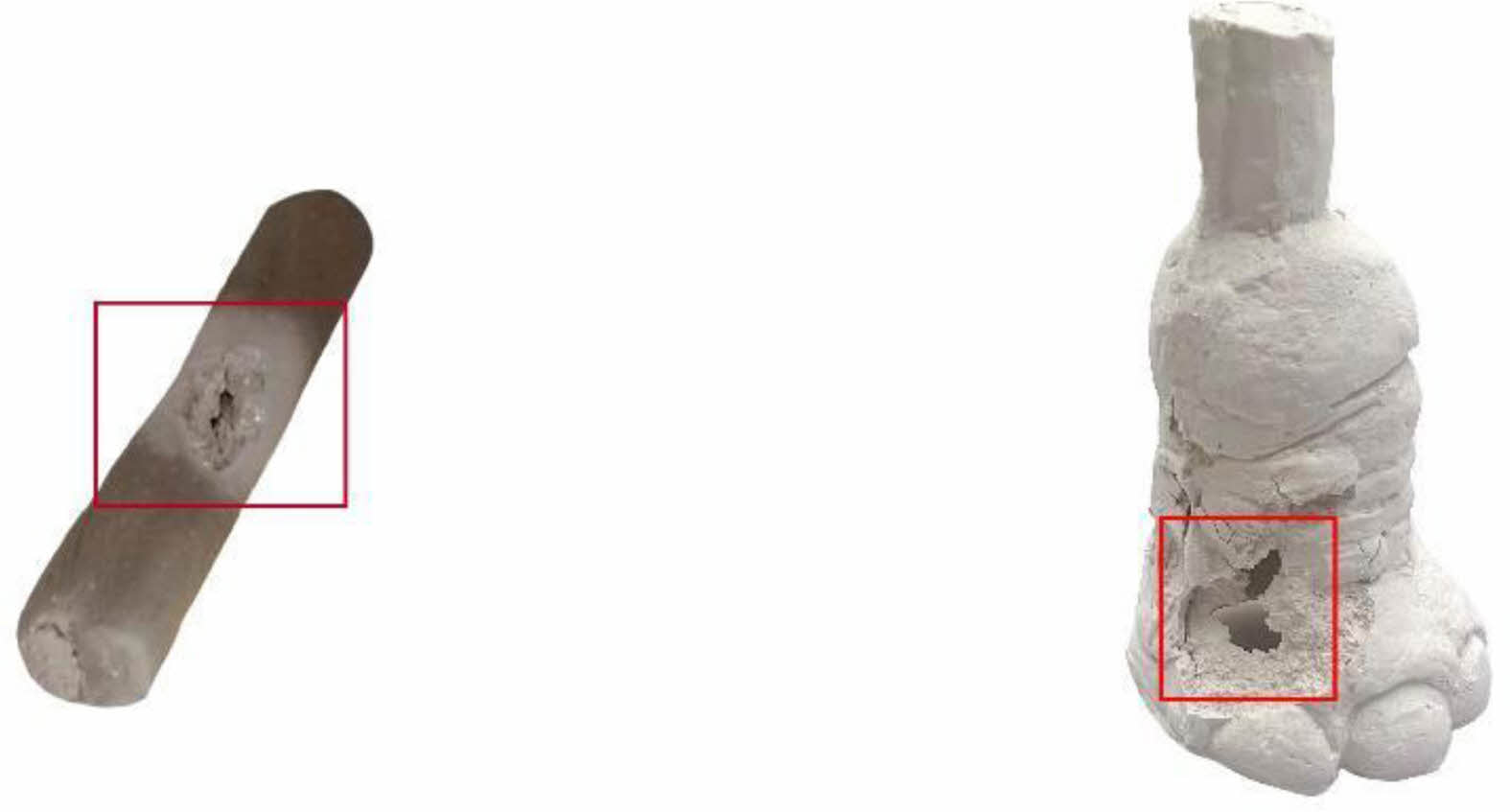Fig. 3 Damage due to model breakage Cy2 and Be4 from left to right. |