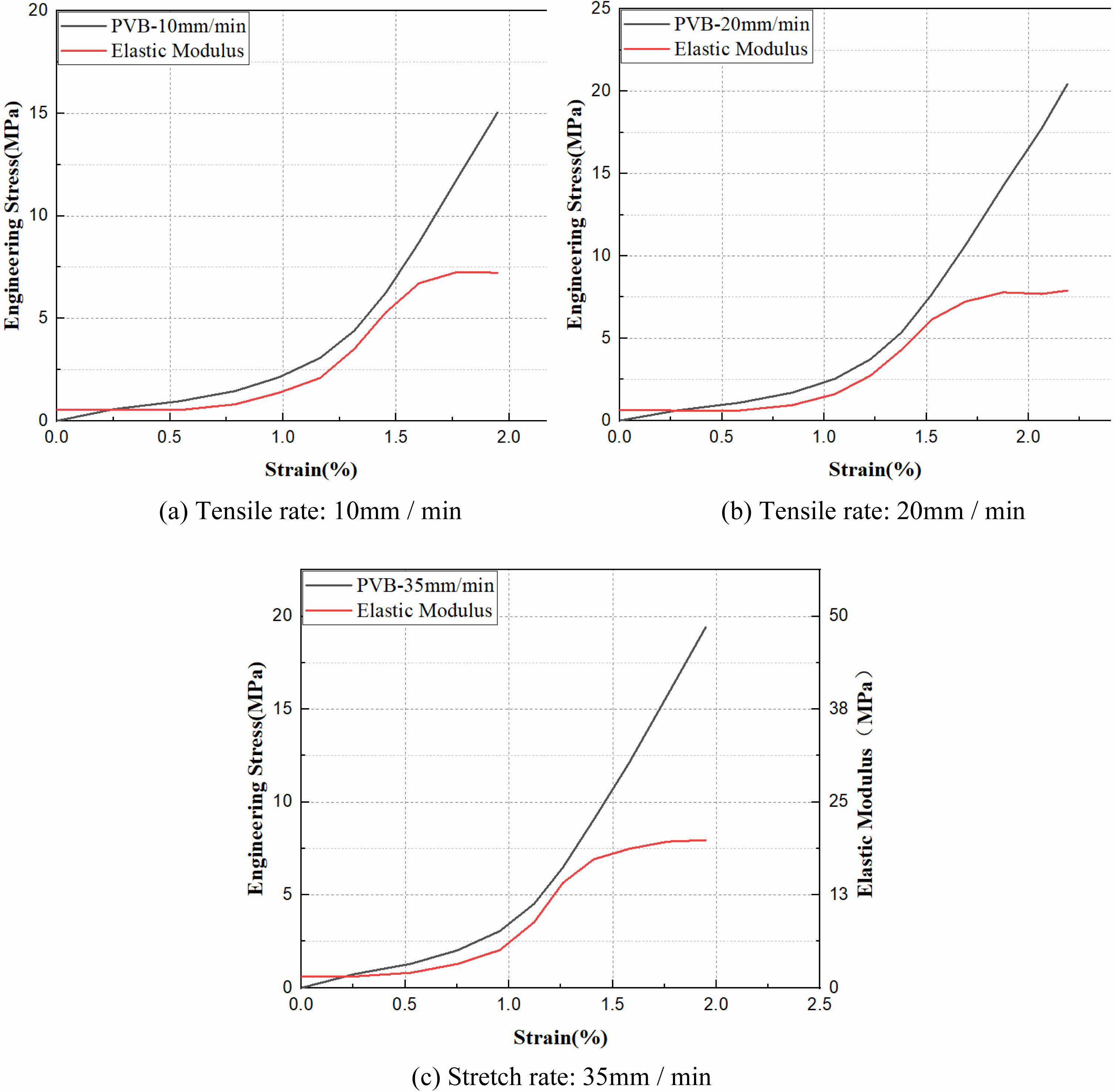 Fig. 10 Stress-straain and elastic modulus curves of PVB specimen at 10 mm/min, 20 mm/min, 35 mm/min. |