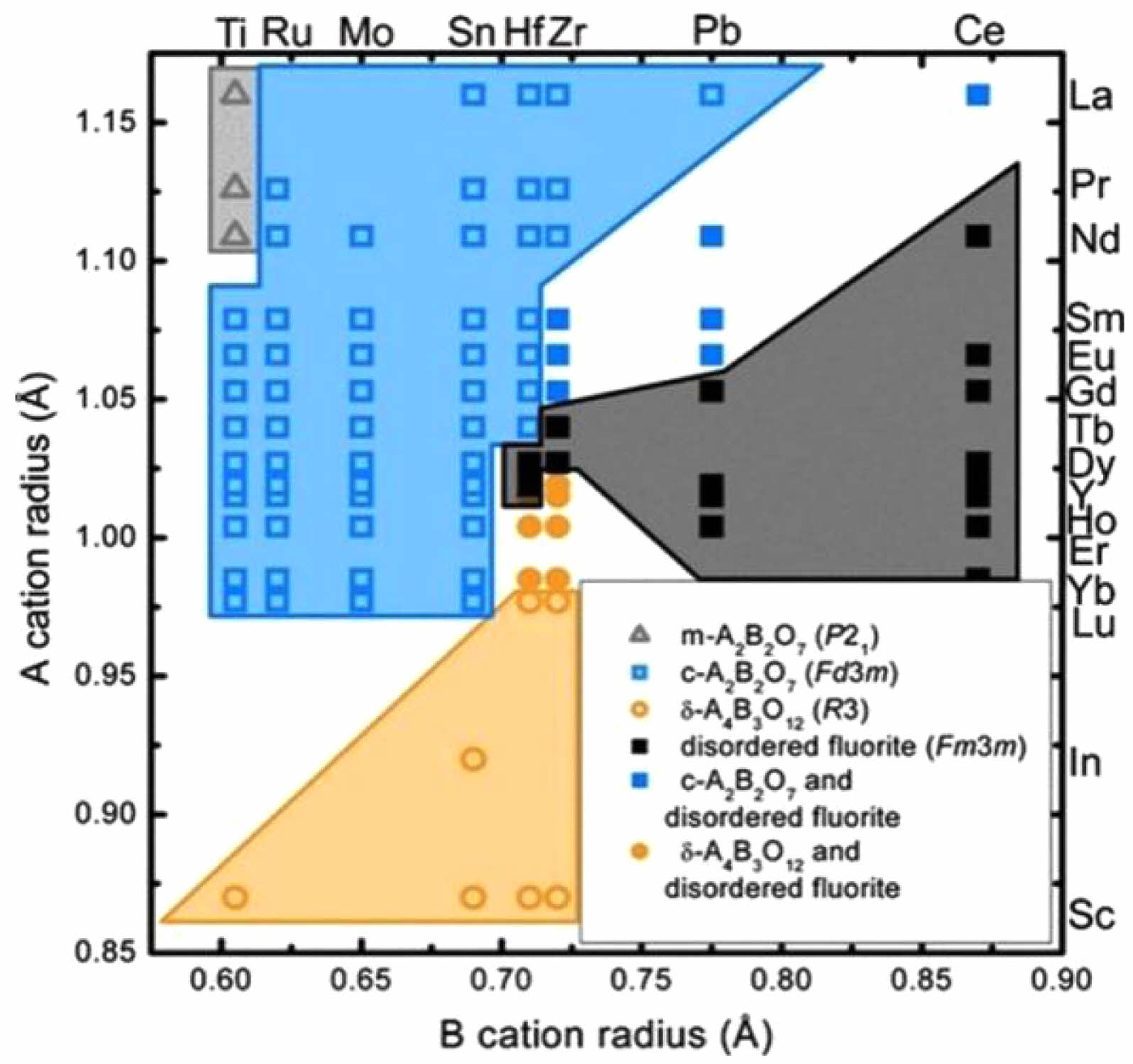 For the δ-A4B3O12 oxides, the ionic size of the cation A3+ ranges from Sc3+ to Ho3+, and the cation B4+ ranges from Ti4+ to Zr4+ [98]. Throughout the compositional range, part of δ-A4B3O12 undergoes an ordered-disordered transition from δ-A4B3O12 to A4B3O12 with a disordered fluorite structure in a high-temperature environment. Bogicevic et al. [99, 100] predicted the ordered cationic structures of δ-Y4Zr3O12 and δ-Sc4Zr3O12 using density-functional theory. The cationic arrangement of Y4Zr3O12 was predicted by calculating the lattice energies of 45 different configurations of 19 protocells. For the ordered structure of Y4Zr3O12, it was calculated that position 3a was completely occupied by Zr4+, and position 18f was occupied by Y3+ and Zr4+ in an ordered arrangement.
