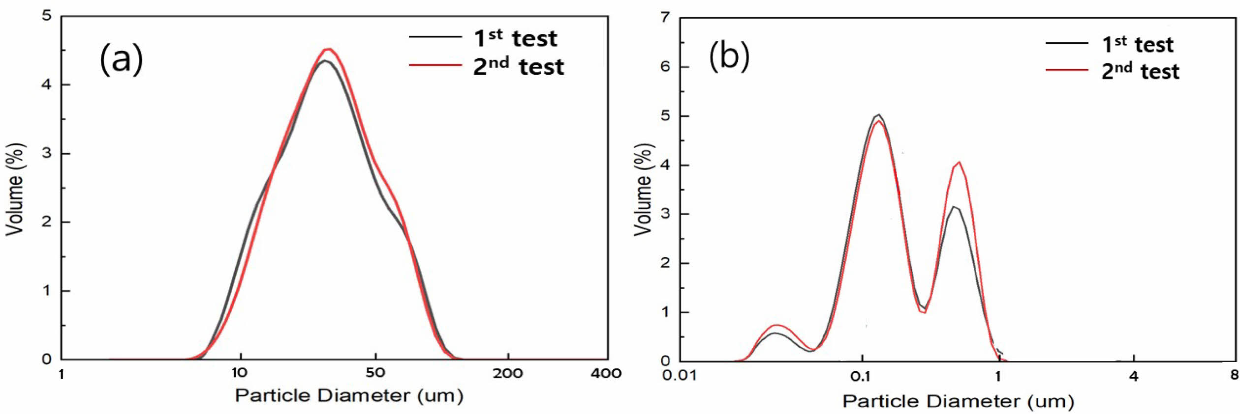 Fig. 2 Particle size distribution of (a) commercial Si powder and (b) SiO2 and Si powder mixtures after planetary milling. |