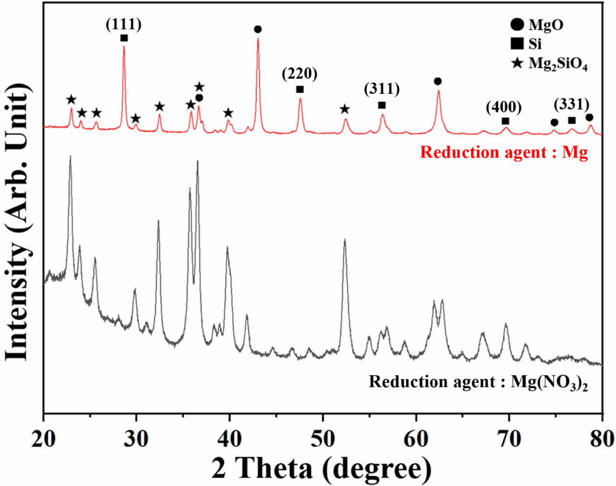 The changes in the crystalline structure of the SiOx powder after the addition of Mg or Mg(NO3)2 as a reducing agent and the vacuum heat treatment are shown in Fig. 4. In both cases, the samples were fabricated without adding NaCl. When the Mg powder was used as the reducing agent, oxidized MgO, reactant Mg2SiO4, and crystalline Si peaks were observed. As an amorphous SiO2 peak was not observed at approximately 25°, most of the amorphous SiOx powder is considered to be reduced through the reduction process or formed a reactant with Mg. Chen et al., synthesized mesoporous Si through magnesiothermic reduction by performing heat treatment at 650 °C in a N2 atmosphere. An the XRD analysis of the synthesized particles revealed Si (111), (220), (311), (400), and (331) peaks, whereas MgO, Mg2Si, and Mg2SiO4 were observed as by-products [7, 13-15]. In this experiment, heat treatment was conducted at 800 °C in a vacuum atmosphere. Si synthesized through reduction displayed clear peaks on five crystalline planes, consistent with the findings of Chen et al. [7]. However, Mg2Si was not observed, suggesting that the reduced Si did not react with Mg in the vacuum atmosphere. In the previous study, for the reduction of spherical monodisperse silica particles, a nitrogen gas atmosphere mixed with 5% hydrogen was applied without Mg powder, and carbothermal reduction method was also tried by adding some carbons to selectively remove oxygen atoms in the silica. However, crystalline Si peak was not observed in the XRD examination [16, 17].