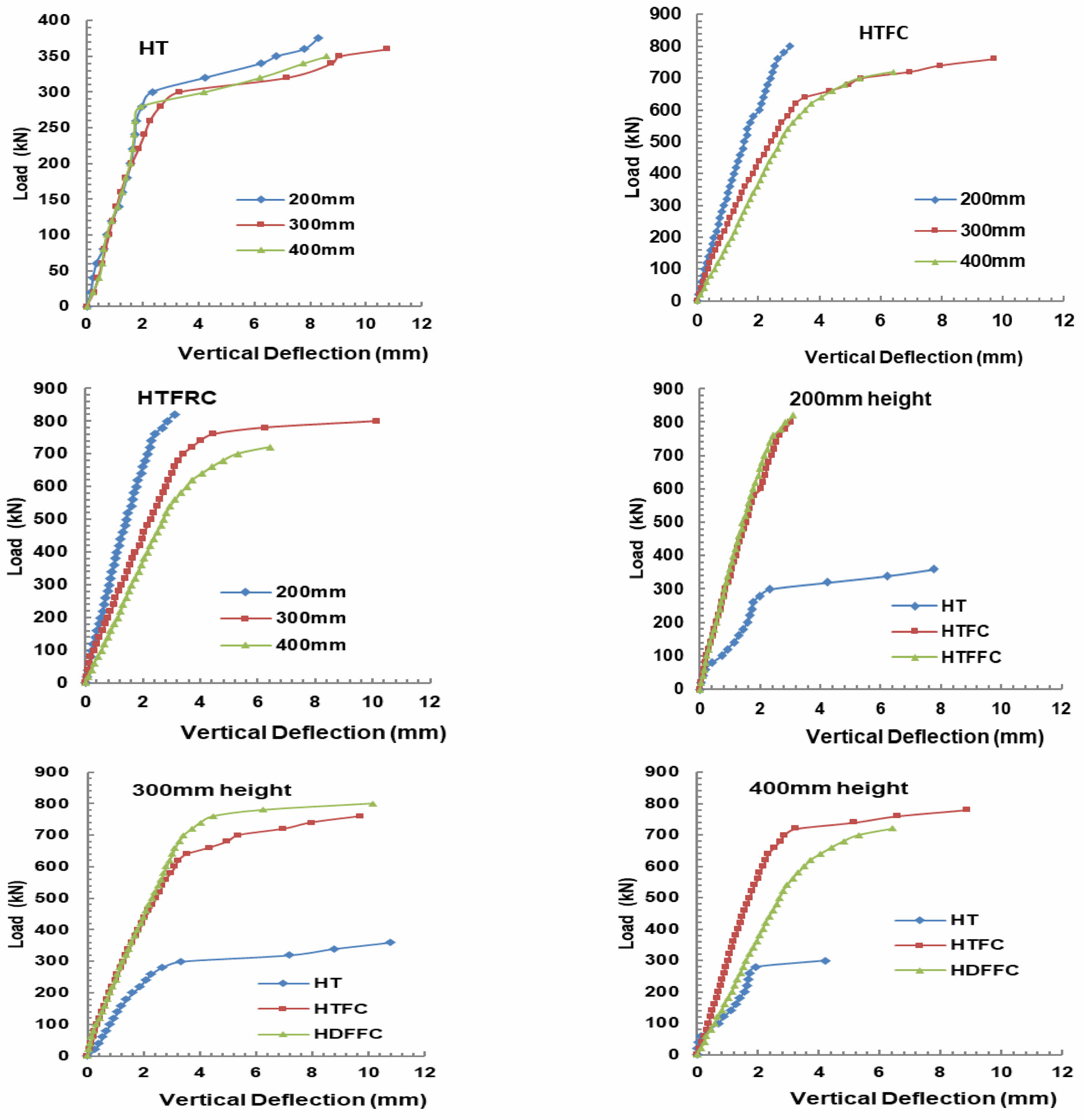 At different load intervals, vertical shortening of column specimens was observed by using dial gauge. Fig. 3 shows the vertical shortening of columns tested under uniaxial compression. Comparison of vertical shortening of HT, HTFC and HTFRC columns at different height and also at 200 mm, 300 mm and 400 mm height columns with hollow, HTFC and HTFRC specimens separately. The vertical shortening in HT columns showed marginal difference up to 200 kN load but in HTFC and HTFRC columns the shortening height are reduced by reducing the height of the columns right from the load starting point and also the stiffness is increased. Compared to HTFC, the HTFRC showed 20.48%, 6.25% and 0.56% increased in stiffness for 200, 300 and 400 mm height columns, respectively.