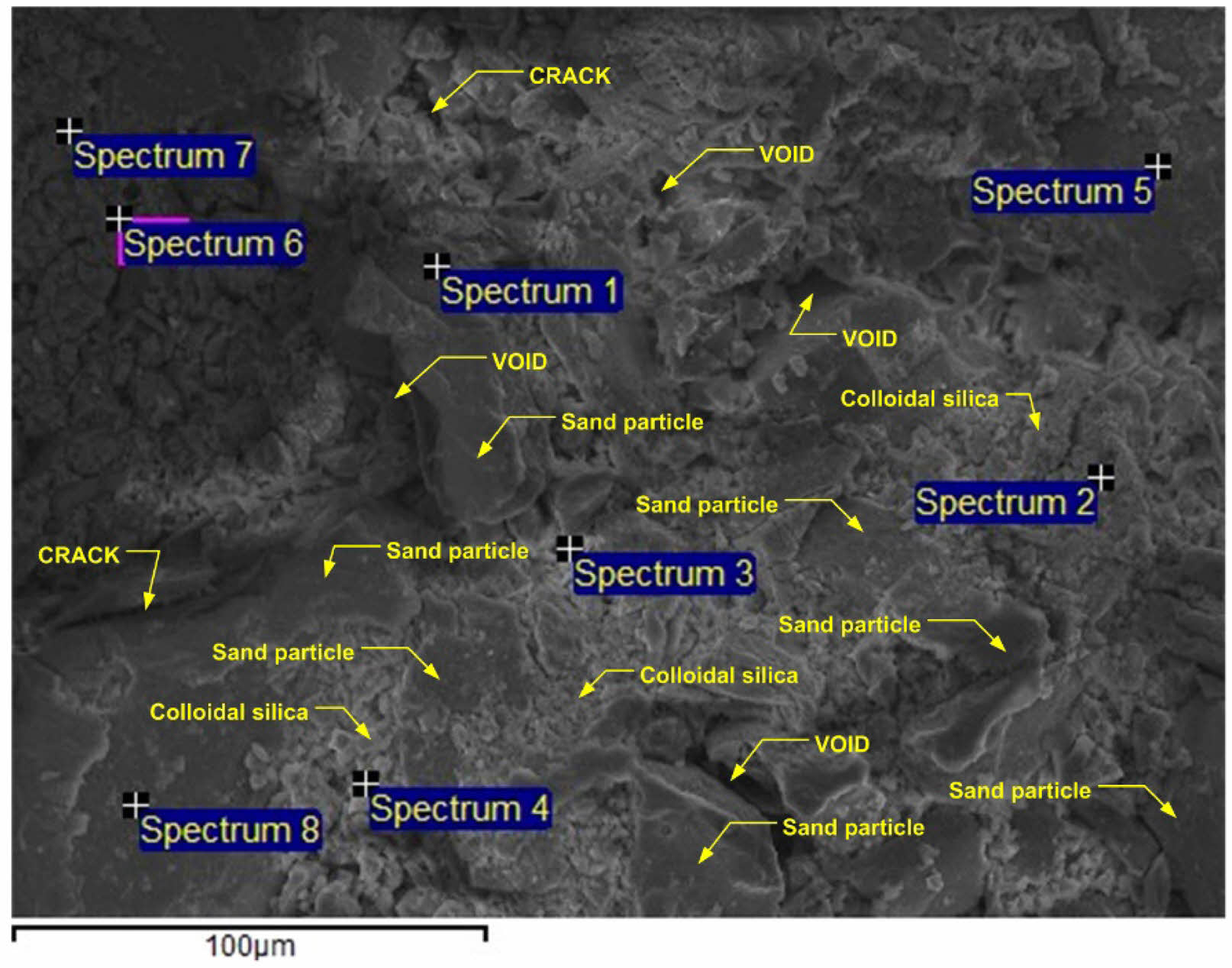 The features of colloidal silica in the image are identified as the rheological flow properties of the slurry after the sintering process. These features show that the colloidal silica exhibits mechanical adhesion and bonding between the aggregates, with irregular surface shapes. The slurry acts as a binding medium to form agglomerations of the particles that make up the ceramic shell mold.