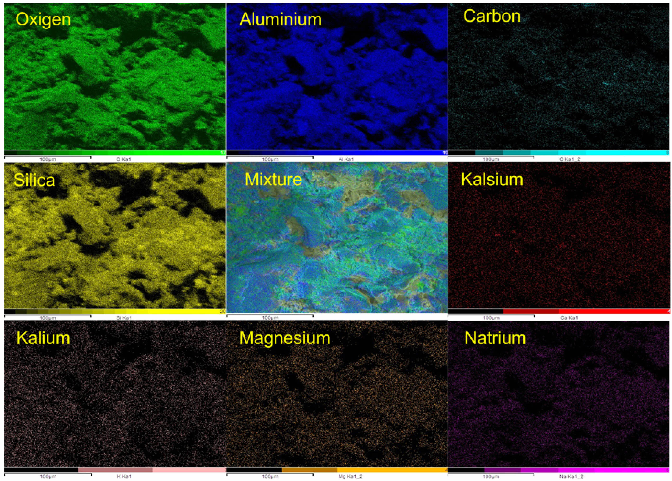 Figure 5 explains the distribution map of elements contained in the ceramic shell of the investment casting mold after sintering at 1050 °C. The mixed map shows that the silica content is unevenly distributed over large, separated areas. Oxygen content is also unevenly distributed, represented in green, across numerous separated areas. Aluminum is also present in the mixed