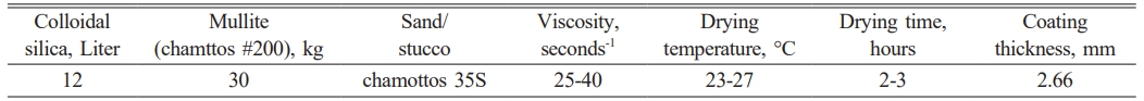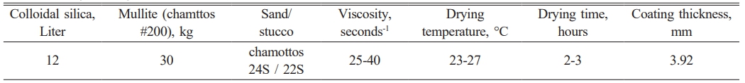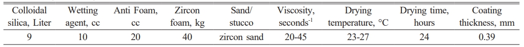 The wax pattern coated with the first slurry is dried for 24 hours, dried at a temperature of 23-27 °C, for 24 hours. After drying and hardening, and obtained a layer thickness of 0.39 mm, it is then dipped into the second slurry, with the materials shown in Table 2.