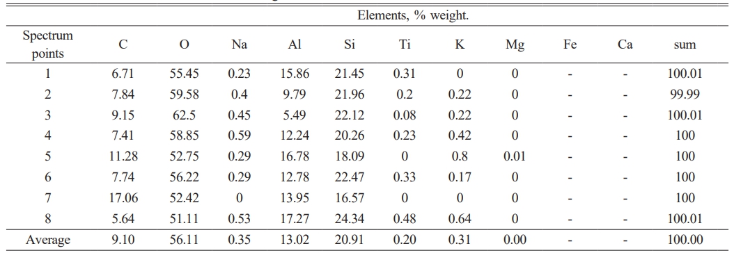 The weight percentage content of each element is shown in Table 5. All spectrum points indicate that the element with the highest weight percentage is oxygen, with an average content of 56.11% by weight. The silica content shows a weight percentage of 20.91%. Aluminum content is 13% by weight, and carbon is 9.10% by weight. All element contents in the ceramic shells sintered at 1050 °C are shown in Table 5. These elements are C, O, Na, Al, Si, Ti, K, and Mg. Not all spectrum points show the same element content, indicating that the distribution of elements is unlikely to be uniform.