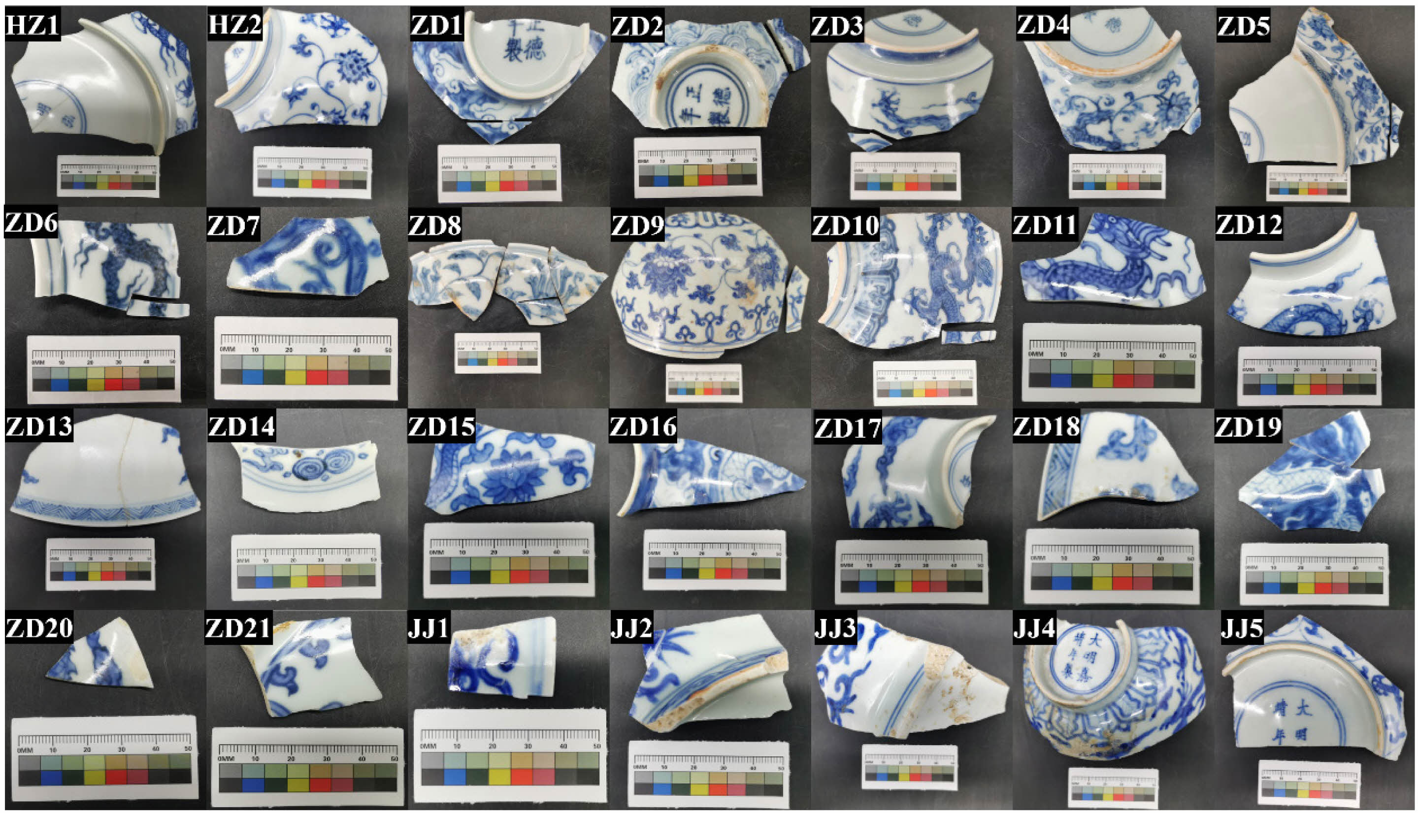 Fig. 2 Photos of blue-and-white porcelain samples. HZ1 and HZ2 sherds (Hongzhi in Ming Dynasty, AD 1488-1505), ZD1~ZD21 sherds (Zhengde in Ming Dynasty, AD 1506-1521), and JJ1~JJ5 sherds (Jiajing in Ming Dynasty, AD 1522-1566). |