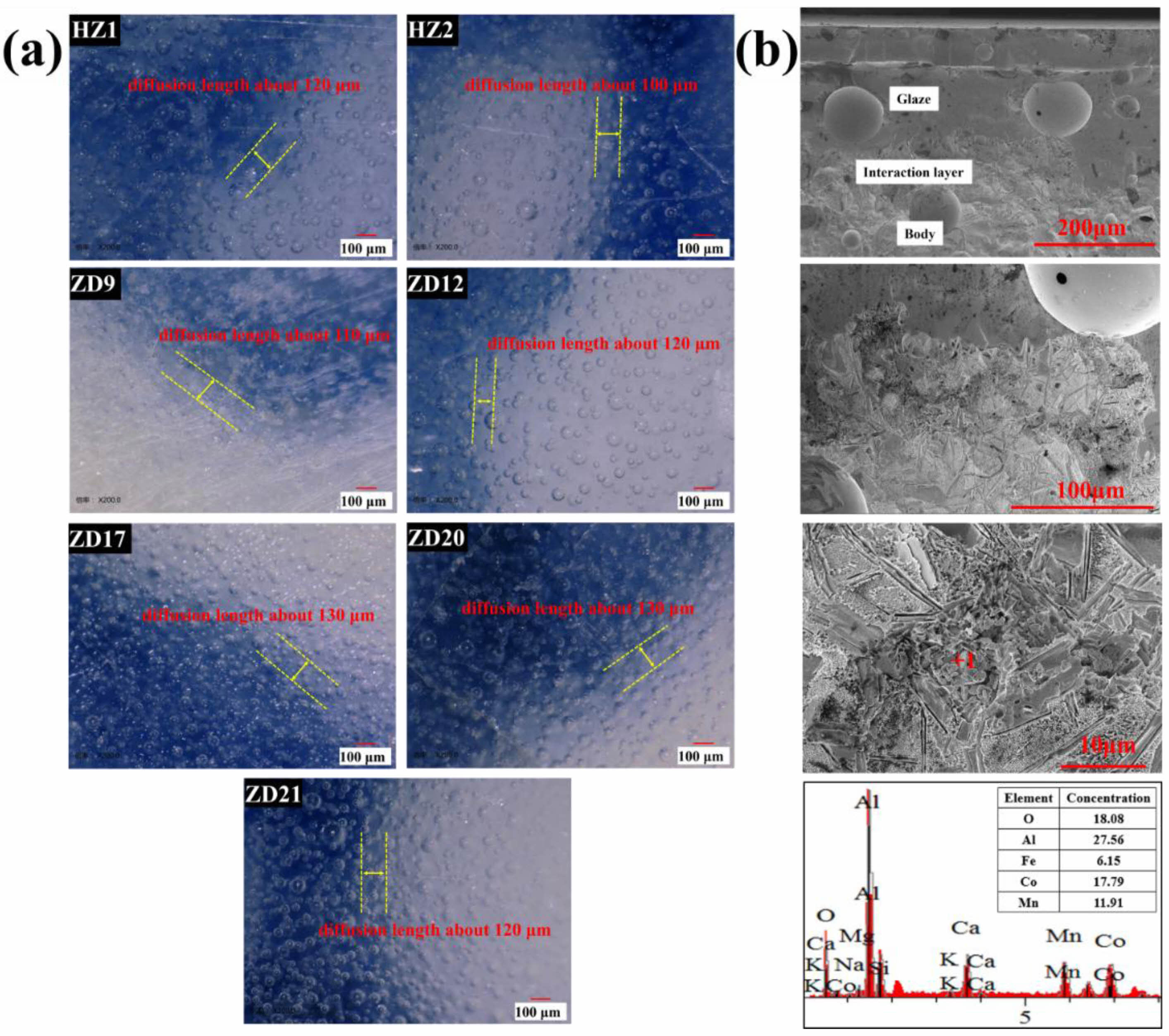 The optical photographs and microscopic structures of the samples from the middle period of Zhengde are shown in Fig. 7. As can be seen from Fig. 7(a) the diffusion distance of blue-and-white porcelain are about 100 μm. Fig. 7(b) shows the SEM-EDS results of the typical sample ZD16. It can be seen from Fig. 7(b) the sample are divided into three layers: a dense glaze layer, an interaction layer and relatively loose body. In the interaction layer exhibit many needle-like crystals and particles with the different shapes. EDS results at point 1 in Fig. 7(b) show that the particles are composed of Co+Fe+Mn, Al and O elements with an atomic ratio of about 1: 2: 4, which are close to the stoichiometry of Co-spinel crystals.