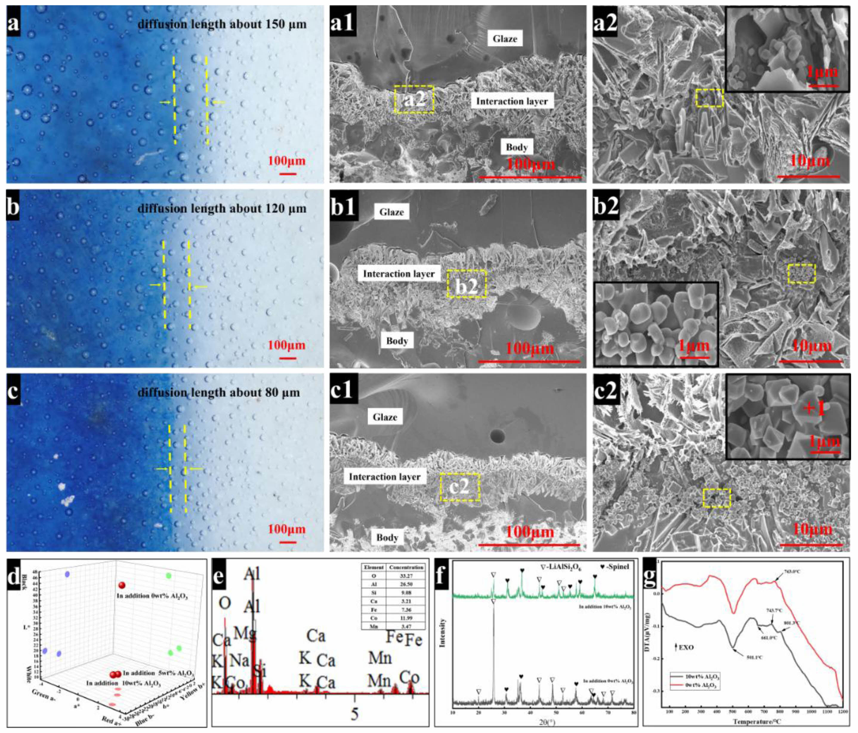 Fig. 9 shows the results of the archaeological experiment. Fig. 9(a, b, c) shows the photos of samples with different Al2O3 contents of the cobalt-blue pigment. As can be seen from the Fig. 9(a, b, c), as the Al2O3 content in the cobalt blue pigment increases, the diffusion distance of the blue-and-white porcelain samples decreases from 150 μm to 80 μm. The value of b* decreased from -19.4 to -28.16 (Fig. 9(d)). Fig. 9(a1, b1, c1) shows the microstructure of the interaction layer. It can be seen from Fig. 9 (a1, b1, c1) the samples are divided into three layers: a dense glaze layer, an interaction layer and relatively loose body. In the interaction layer exhibit many needle-like crystals and particles with the different shapes Fig. 9(a2, b2, c2), moreover, as can be seen from the inset images of Fig. 9(a2, b2, c2), with the increase in Al2O3 content, the number of residual particles in the interaction layer increases, and their shapes gradually transform into octahedrons. EDS results at point 1 in the inset image of Fig. 9(c2) show that the particles are composed of Co+Fe+Mn, Al and O elements with an atomic ratio of about 1: 2: 4 (Fig. 9(e)), which are close to the stoichiometry of Co-spinel crystals. From the XRD analysis of the cobalt-blue pigment (Fig. 9(f)), it can also be seen that as the Al2O3 content increases, the amount of Co-spinel crystal phase (PDF card: 70-0753) increases. The DTA graph (Fig. 9(g)) also shows an increase in Al2O3 content. There is a very obvious exothermic peak at 801.3 °C, which proves the formation of spinel. It can be seen from that the Al2O3 content in the cobalt-blue pigment is the key factor for the formation of Co-spinel.