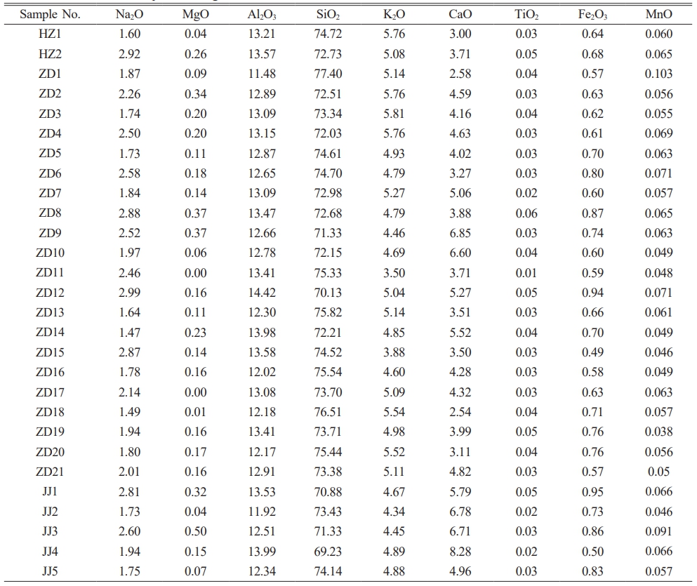 The optical photographs and microscopic structures of the samples from the late Zhengde and Jiajing period are shown in Fig. 8. As can be seen from Fig. 8(a) the diffusion distance of blue-and-white porcelain are about 180~650 μm. Fig. 8(b) shows the SEM-EDS results of the typical sample JJ4. It can be seen from Fig. 8(b) the sample are divided into three layers: a dense glaze layer, an interaction layer and relatively loose body. In the interaction layer exhibit only many needle-like crystals and few particles with the different shapes. The EDS results at points 1 in Fig. 8(b) indicate that the ratio of Co+Fe+Mn, Al and O elements in the particles is not 1:2:4, from this, it can be concluded that there are no Co-spinel crystals in the interaction layer.