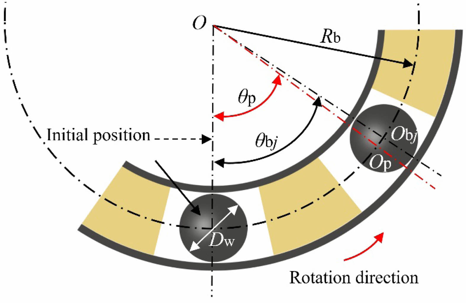 Let δpb be the contact deformation between the rolling element and the pocket. When δpb ≥ 0, it indicates that contact occurs between the rolling element and the surface of the pocket. Combining with the positional relationship between the rolling element and the cage pocket in Fig. 4, the expression for the contact deformation δpb is: