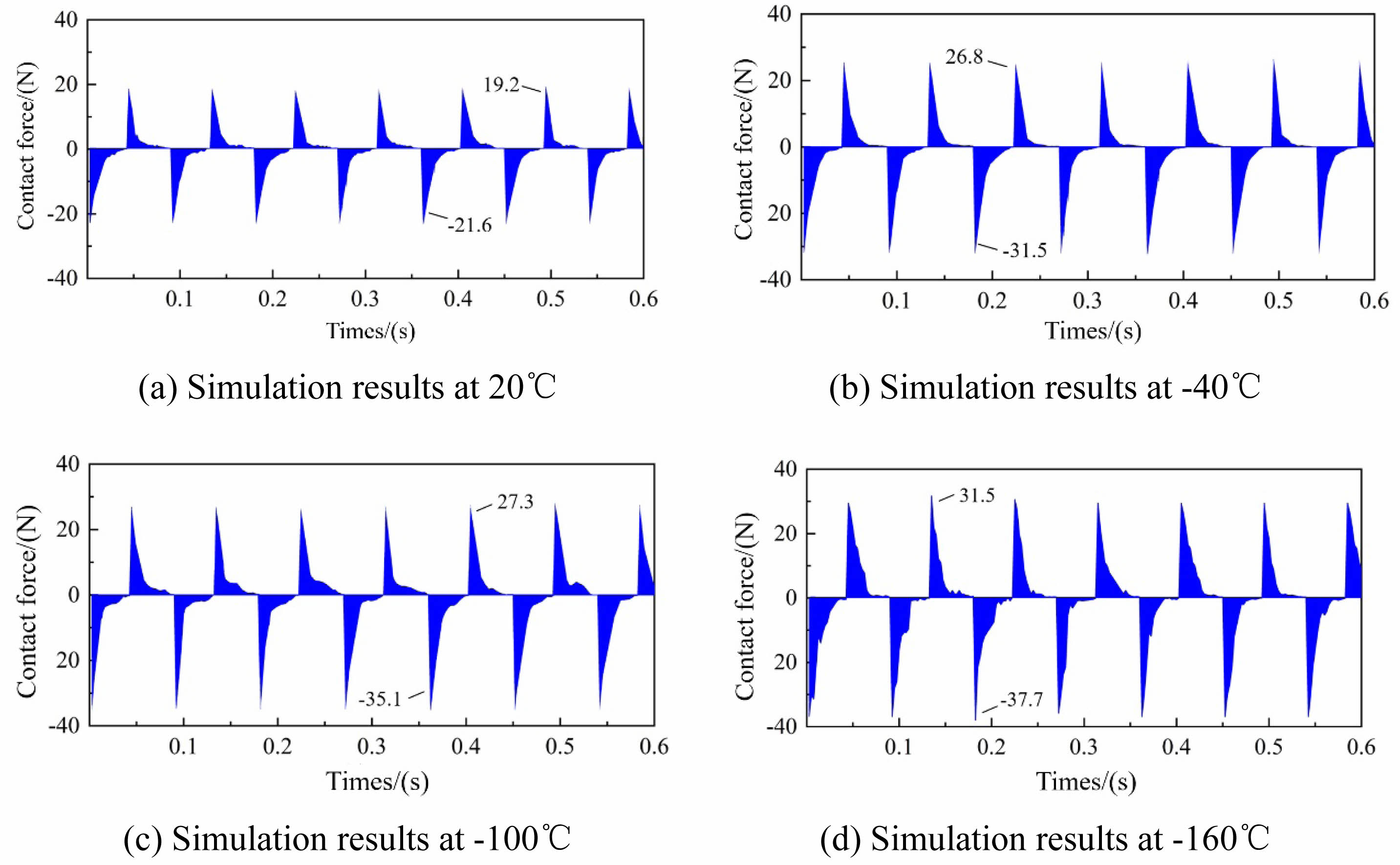 Calculations and analyses were conducted within the range of working conditions with a load of 1 kN, a frictional linear velocity of 0.36 m/s, and temperatures of 20 ℃, -40 ℃, -100 ℃, and -160 ℃. The variation of contact forces between the rolling elements and the cage over time is shown in Fig. 5. As can be seen from the figure, a positive contact force indicates that the rolling element is in contact with the front end of the cage pocket, while a negative value indicates contact with the rear end. The rolling elements experience intermittent collisions with the front and rear ends of the cage pockets, and the amplitude of contact forces varies with each collision, indicating a certain degree of uncertainty in the contact between the rolling elements and the cage pockets [32]. Furthermore, the computational results show that the actual contact force between the rolling elements and the cage is much less than the load applied to the bearing. As the temperature decreases, the contact force between the rolling elements and the pocket surfaces of the cage gradually increases. When the temperature reaches -160 ℃, the maximum contact force reaches -37.7 N. The reason for this result is that as the test environment temperature decreases, PTFE exhibits increased hardness. When the rolling elements come into contact with pocket surfaces of different hardness levels, the harder pocket surfaces will reflect a greater contact force. The above results will provide parameter basis for the subsequent experiments on the friction and wear performance and lubrication characteristics of PTFE cage materials and silicon nitride balls.