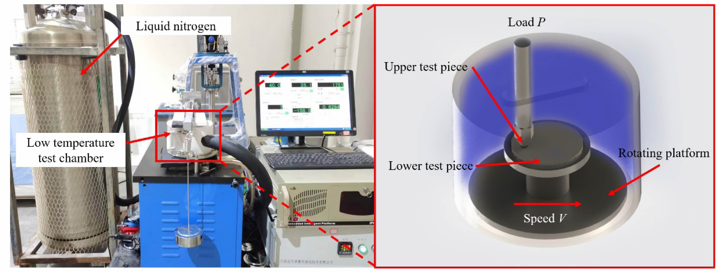 Fig. 6 Structure and working principle of low temperature friction and wear testing machine. |